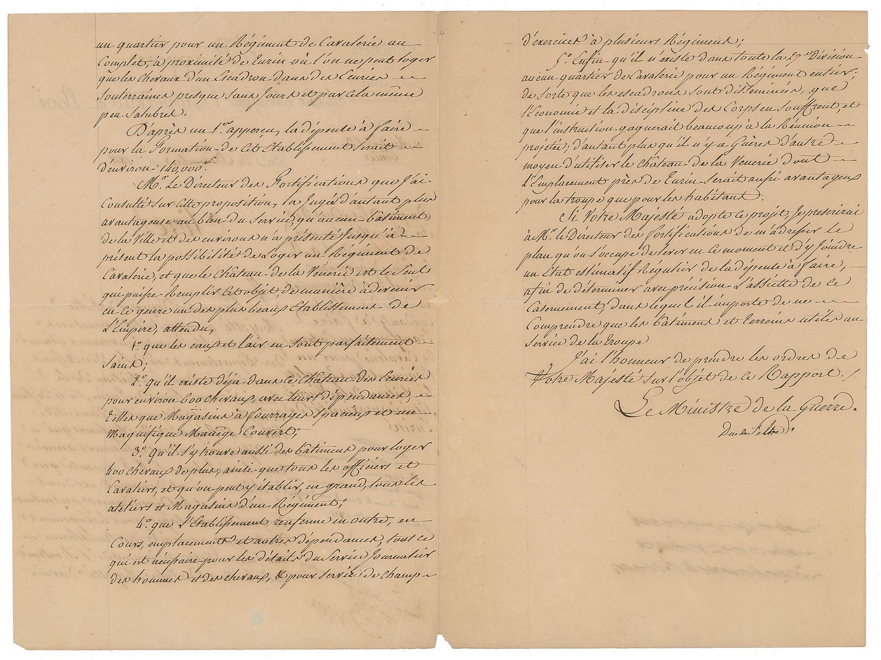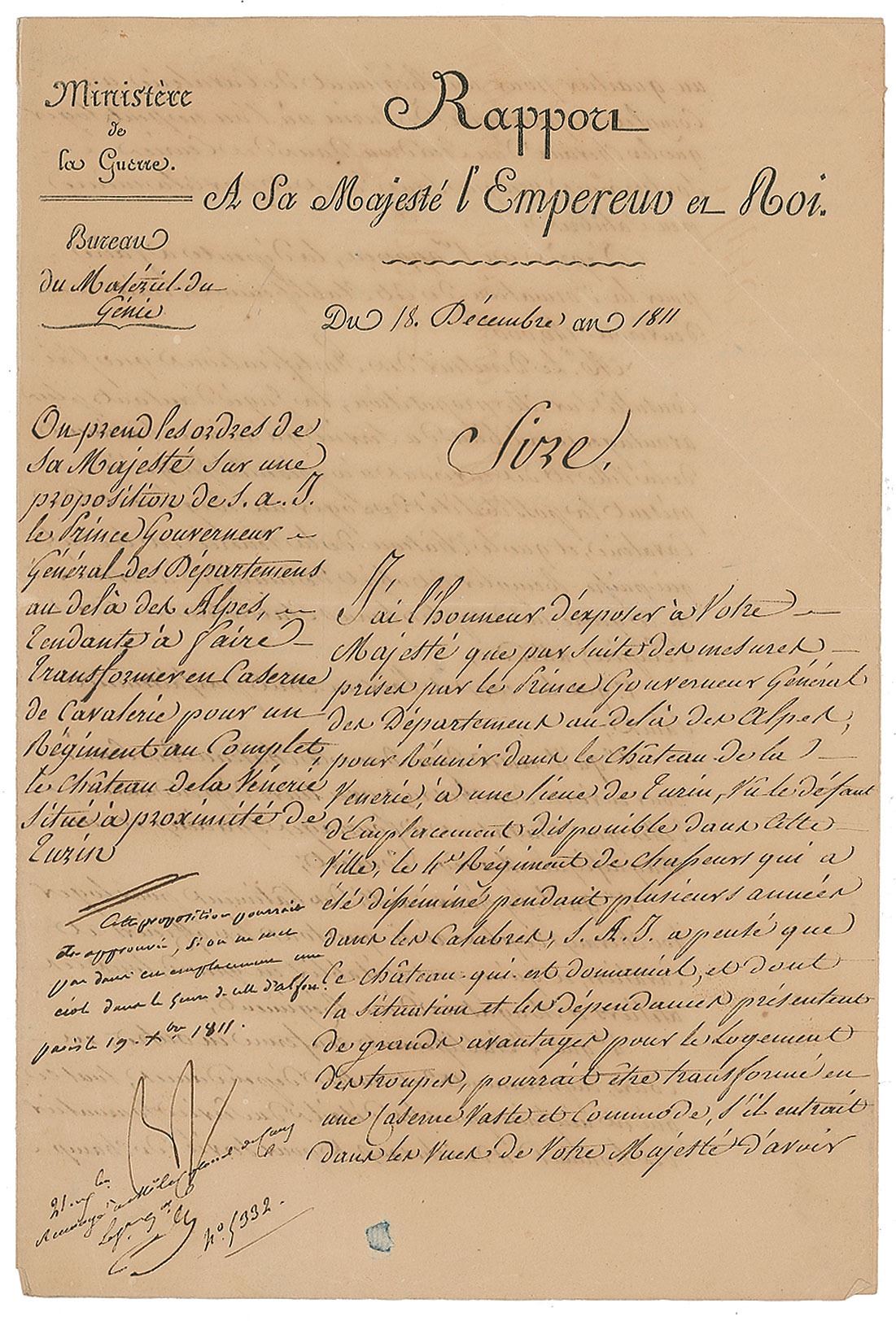 Manuscript DS, in French, signed “Np,” three pages on two adjoining sheets, 8.25 x 12.25, December 18, 1811. Official military document signed by the Duc de Feltre, requesting the Palace of Venaria near Turin be turned into a cavalry barracks, endorsed in the left margin by Napoleon on December 19, 1810. In fine condition, with some light diagonal creasing. The Palace of Venaria, originally designed and built outside of Turin in 1675, was indeed transformed into a barracks under Napoleonic domination—the structures were turned into barracks and the terraced gardens destroyed to create a training ground. The complex maintained this military role after the fall of Napoleon, and remained in use by the Italian Army until 1978.