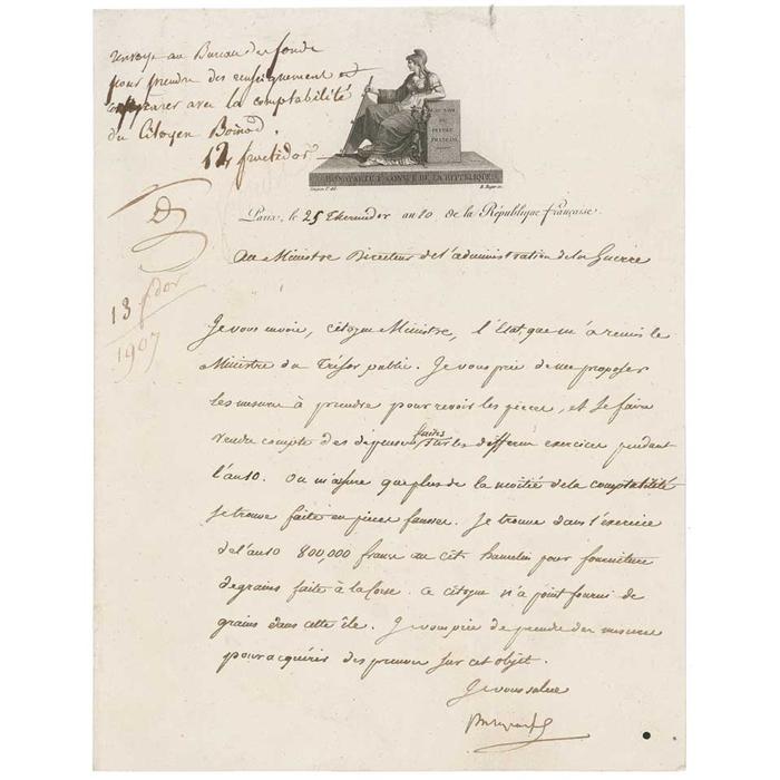 LS in French, signed “Bonaparte,” one page, 7.25 x 9.25, ornate Bonaparte I, Consul de la Republique letterhead, August 13, 1802. Letter to General DeJean, in full: “Citizen Minister, I am sending you the statement that the Public Revenue Office Minister remitted to me. Please suggest to me what action to take to review the documents and have an explanation of expenditure made for the fiscal year 10. I was told to be sure that more than half accounting is made of altered documents. I find in the fiscal year 10 800,000 francs to citizen Hamelin for grain supply to Corsica. This citizen has not provided grains in that island. Please take measures to acquire proofs on this item.” An endorsement to top left in another hand reads, “Sent back to the Funds Office to make inquiries and compare with Citizen Boinod’s accounting.” In fine condition, with light intersecting folds, one passing through a single letter of signature, a few trivial wrinkles, and a small ink spot to right of signature. Napoleon had only been First Consul for a little over a week when he wrote this letter requesting measures to address financial abuses. Pre-certified John Reznikoff/PSA/DNA and RRAuction COA.