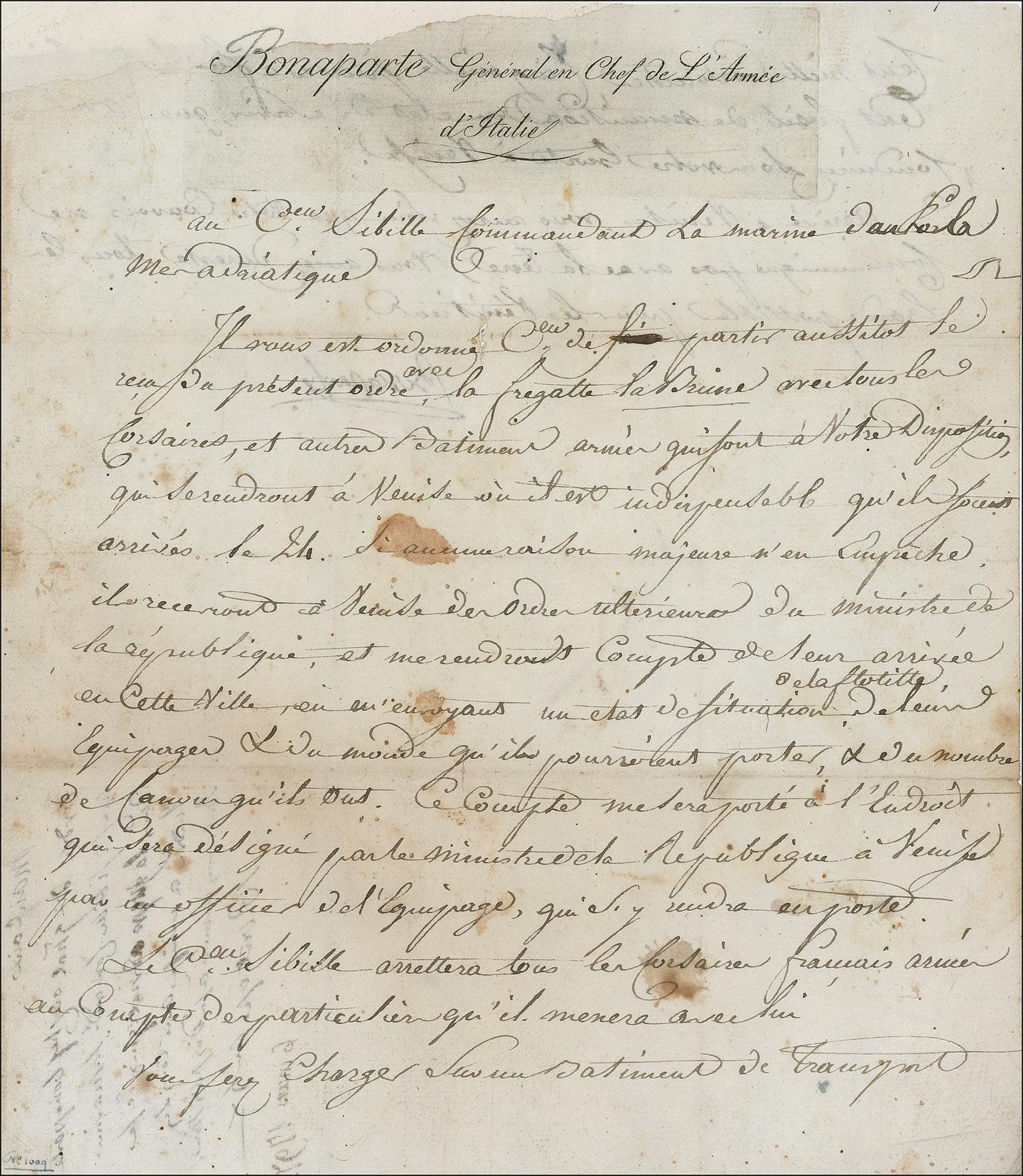 Docketed on the reverse, “Mantoue, Order from General in Chief Bonaparte to Gen Sibille commandant the navy in the Adriatic Sea to go to Venice with all the battleships at his disposal. 16 Ventose year 5.” Expert restoration to missing top left corner, with portions of three missing letters penciled in, light toning along intersecting folds, scattered soiling and a few stains, a couple of small holes to a single line of text, and a block of toning over the letterhead, otherwise very good condition.
