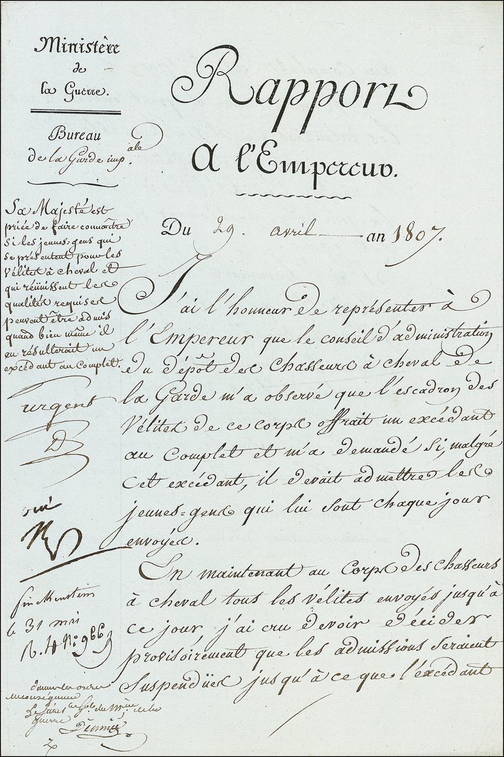 Handwritten endorsement, “Oui, Nap,” in the left border of a manuscript document titled “A Report to the Emperor,” in French, dated April 29, 1807, and signed by Jean-François-Aimé Dejean, head of the Council of Administration. Dejean writes to Napoleon, in full (translated): “I have the honor to represent to the Emperor that the Council of administration of the Chasseurs Cheval de la Garde [Cavalry of the Guard] have observed to me that the squadron of Velites offered an excess of completion and asked me if despite this surplus, it would admit young people who are sent every day. Keeping the Corps of the Chasseurs a Cheval [Cavalry] all the Velites sent up today, I thought it provisionally decided that the admissions would be suspended until the surplus had disappeared in full.