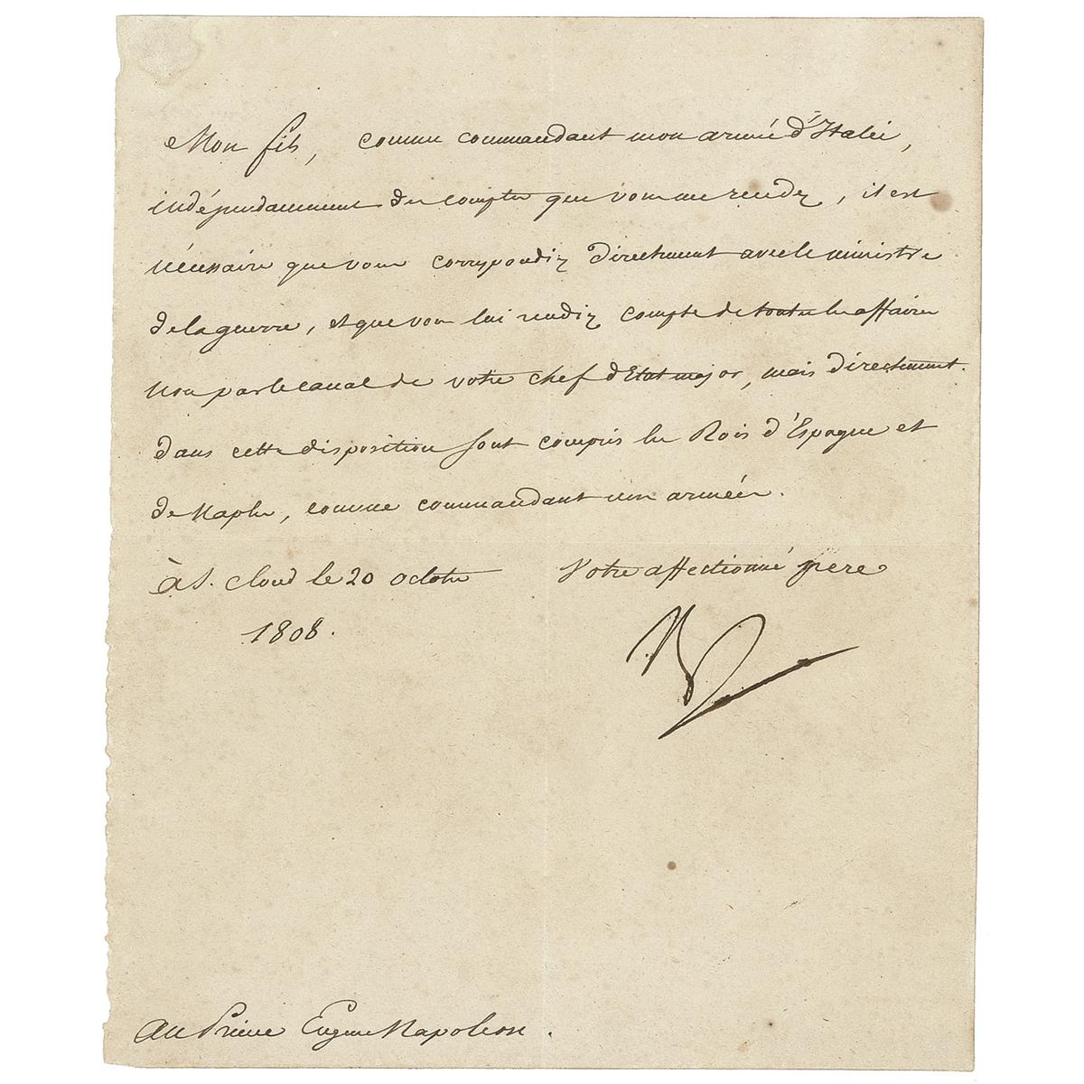 LS in French, signed “Np,” one page, 7.25 x 9, October 20, 1808. Napoleon sends a directive to his stepson, Prince Eugene Napoleon. In full: “My son, as commandant of my army in Italy, independently from the account that you are giving me, it is necessary that you correspond directly with the Minister of war, and that you give him a report of all the affairs, not by the channel of your Chief officer, but directly. In this measure are included the kings of Spain and of Naples, as commandant of an army.” In fine condition, with minor toning, scattered soiling, and show-through from a spot of paper loss on the reverse.