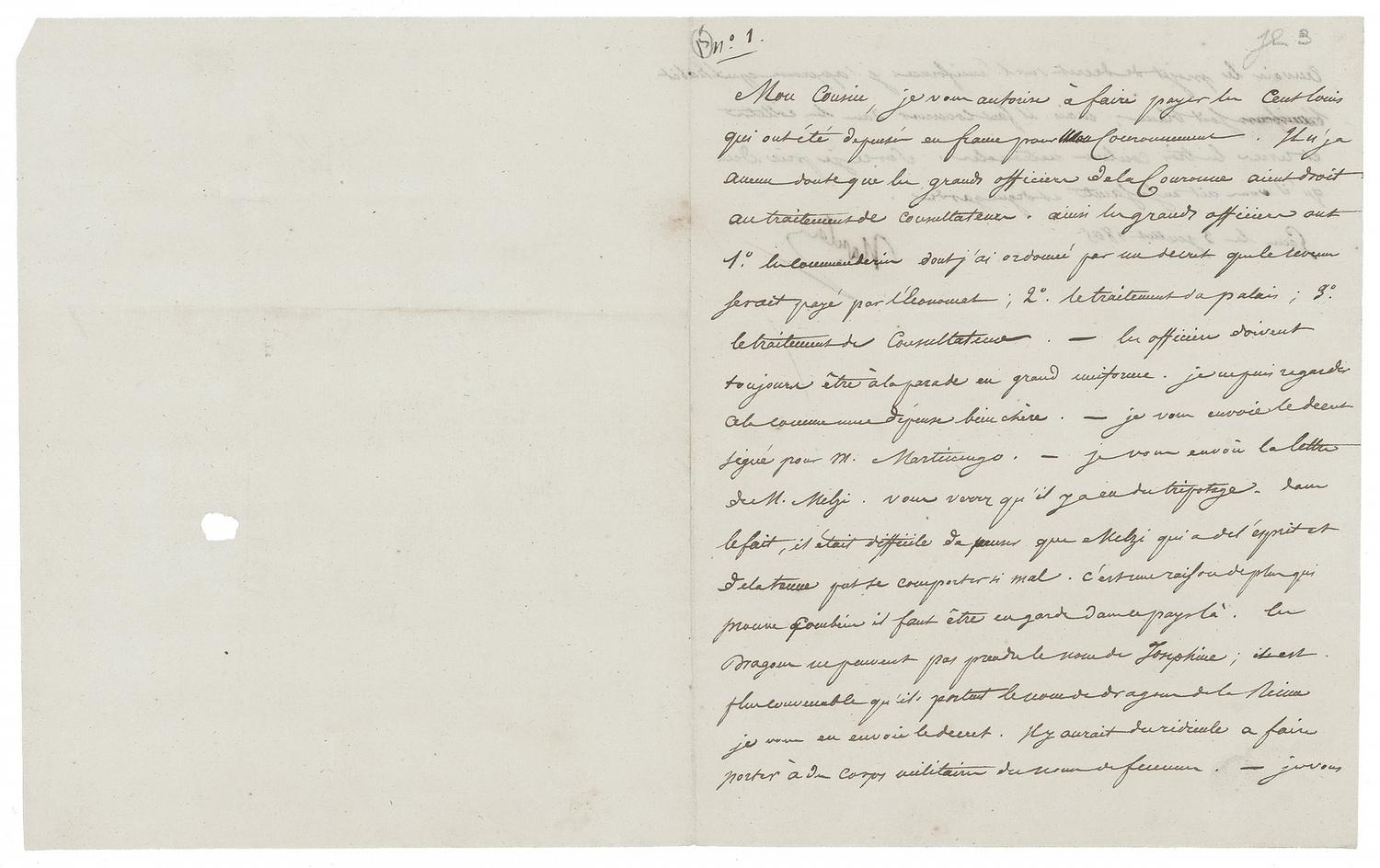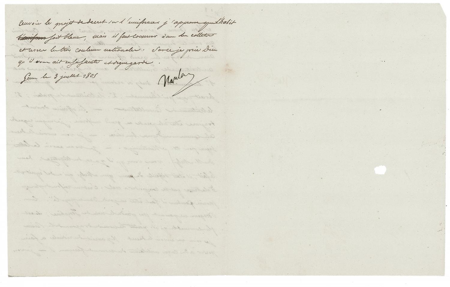 LS in French, signed “Napoleon,” one page both sides, 7.25 x 9, July 3, 1805. Letter reads, in full (translated): “My Cousin, I authorize you to order that the one hundred louis that have been spent in France for my Coronation are paid. There is no doubt that the great officers of the Crown have the right to be paid as consults - therefore the great officers have 1. the commandery for which I have ordered by decree that the revenue would be paid by …; 2. Salary for the law courts; 3. consult salary. - Officers always have to be at the parade in grand uniform. I am not considering this as a great expense. - I am sending you the decree signed by Mr. Martiscengo. - I am sending you Mr. Melzi’s letter. You will see that there is some pawing. In fact, it was difficult to think that Melzi who has such spirit and good manners can act so badly. The more reason this proves how much one has to be on his guards in that country. The dragoons cannot take Josephine’s name; it is more proper that they bear the name dragoons of the Queen. I am sending you the decree for it. It would be somewhat ridiculous to have military corps baring the name of a woman.- I am resending you the decree project on the uniform. I approve that the uniform be white, but the three national colors must be kept on the collar and cuff. And now I pray to God that he keeps you in his holy and worthy guard.” In fine condition, with mild intersecting folds, a bit of scattered light toning, and light show-through from writing on opposing sides.