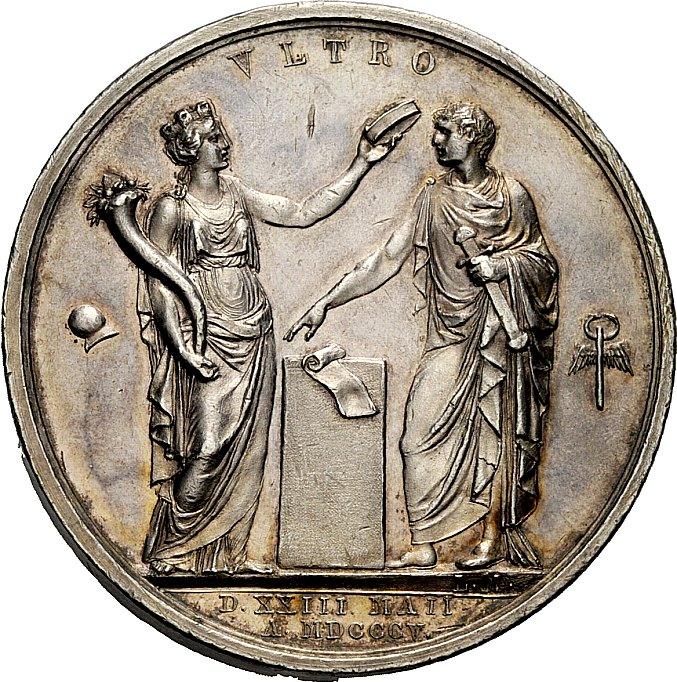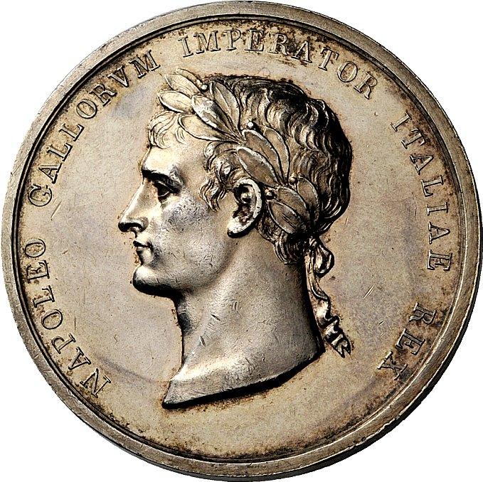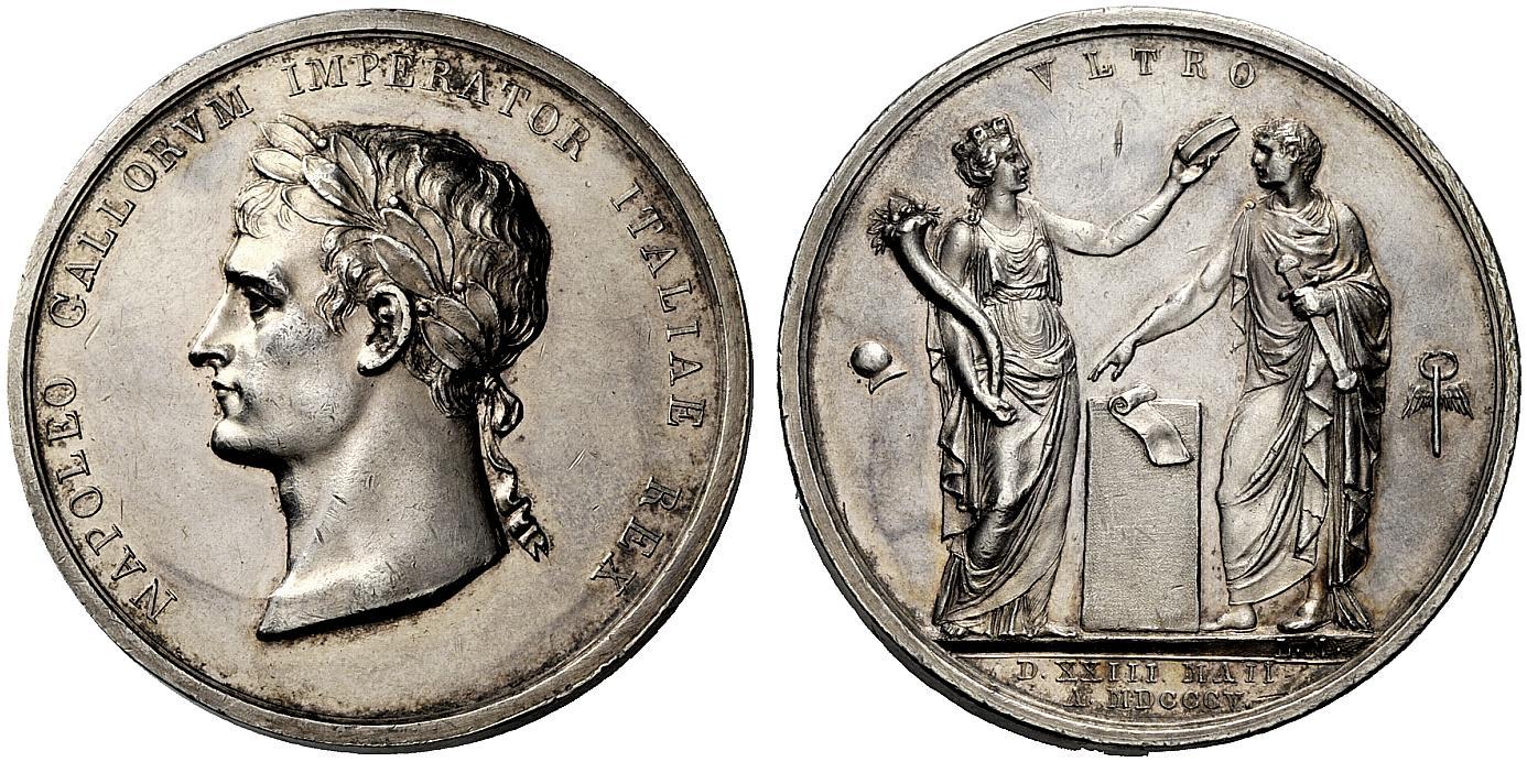 Medaglie e placchette. Napoleone I imperatore dei francesi e re d’Italia, 1805-1814. Medaglia 1805. per l’incoronazione a Re d’Italia (opus: Luigi Manfredini), argento coniato 44,03g. Ø 42 mm. NAPOLEO GALLORVM IMPERATOR ITALIAE REX Testa laureata a s. Rv. VLTRO L’Italia pone la corona ferrea sul capo di Napoleone che giura su di una pergamena posta su di un cippo; ai lati, un elmo corinzio ed un caduceo alato. Sulla linea dell’esergo, a d., L M e, sotto, D XXIII MAII / A MDCCCV. Turricchia 429. Bramsen 420. Molto rara. Coniazione originale. Migliore di Spl Apprendiamo dal Turricchia che di questa medaglia furono coniati 382 esemplari in argento.