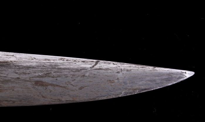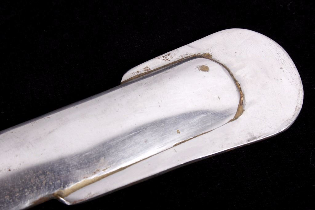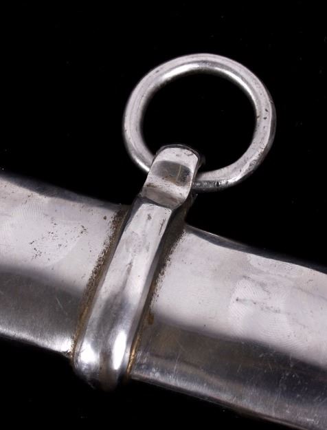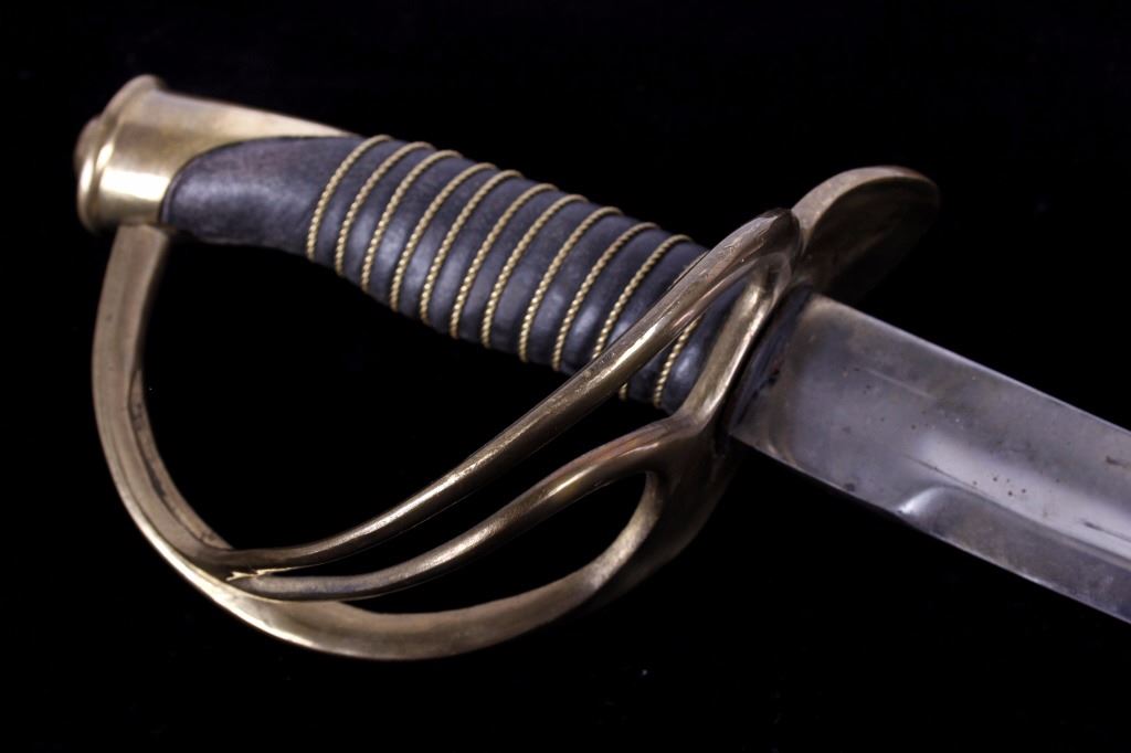 This lot offers a Napoleonic Dragoon Sword Introduced in 1805. This sword features a fine 3-bar brass hilt, with a black leather grip accented by brass furrule, as well as a semi-dome style pommel, all of these features were standard for the Dragoon swords. The scabbard is of nickel color and has a spring system to keep the sword in place, as well as two suspension rings. This sword is an excellent example of an original 1800's Dragoon sword, and is in good condition. Flaws show in the form of wear on the tip of the sword from inserting and retracting from the scabbard, as well, the handle has a small amount of play. The sword measures 42 1/2" long when sitting in its scabbard, 3 3/4" wide, and roughly 5" deep.
