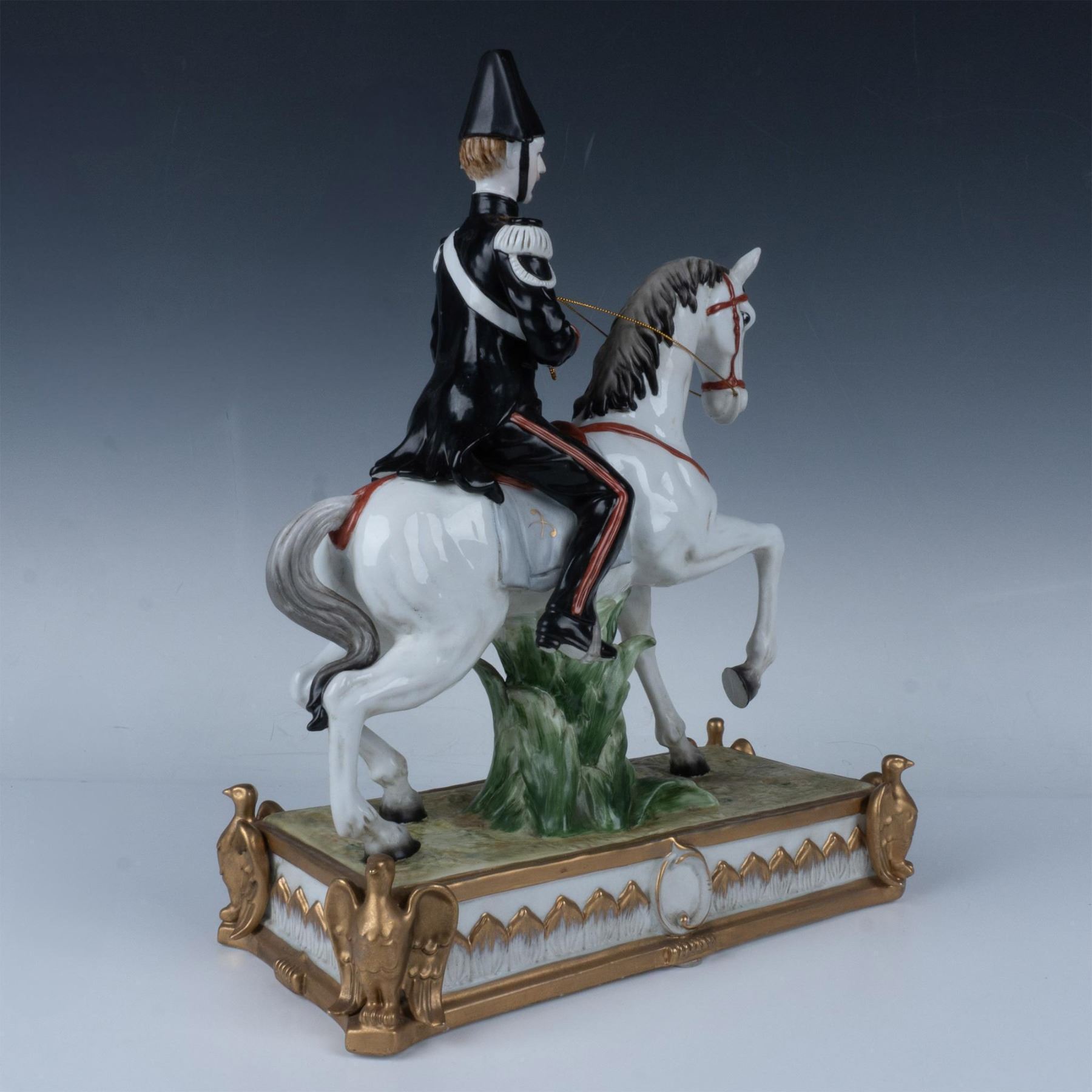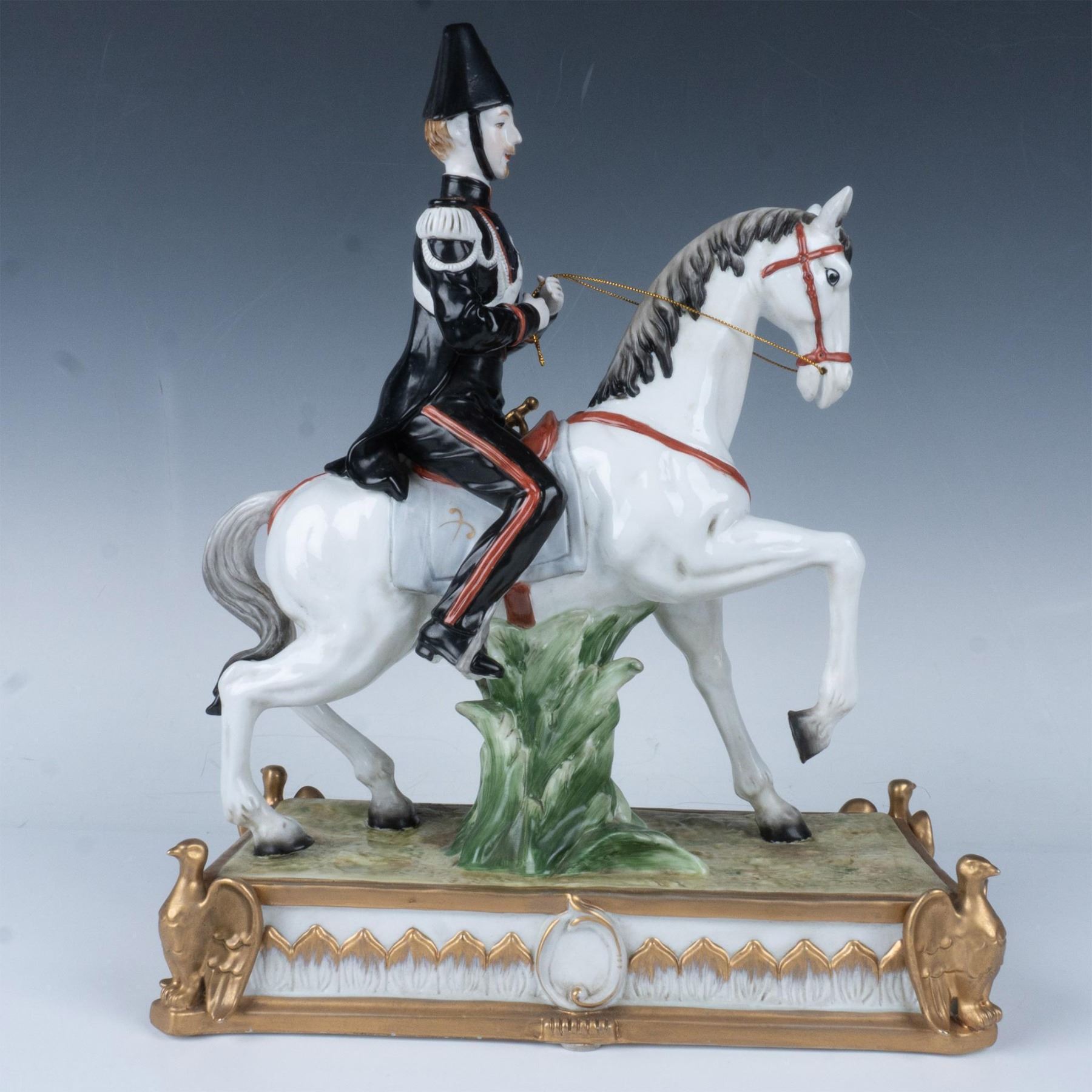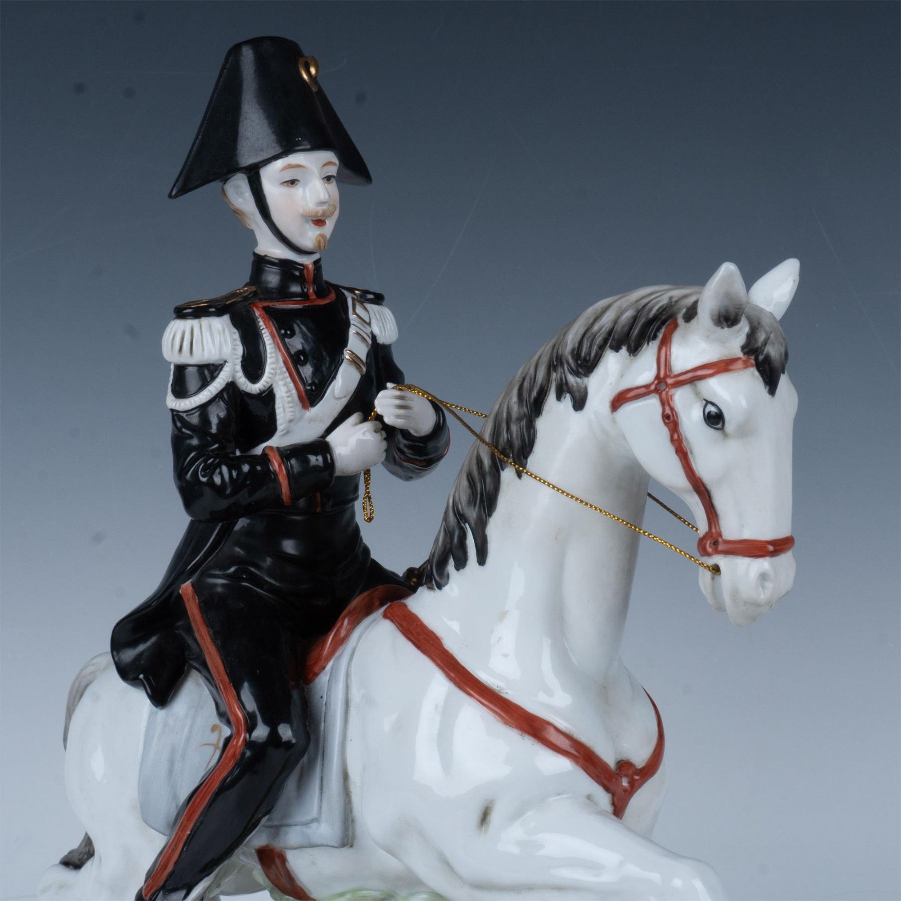Hand decorated figure of a French general in a black dress uniform, riding a white horse. Crossed swords with initial backstamp.