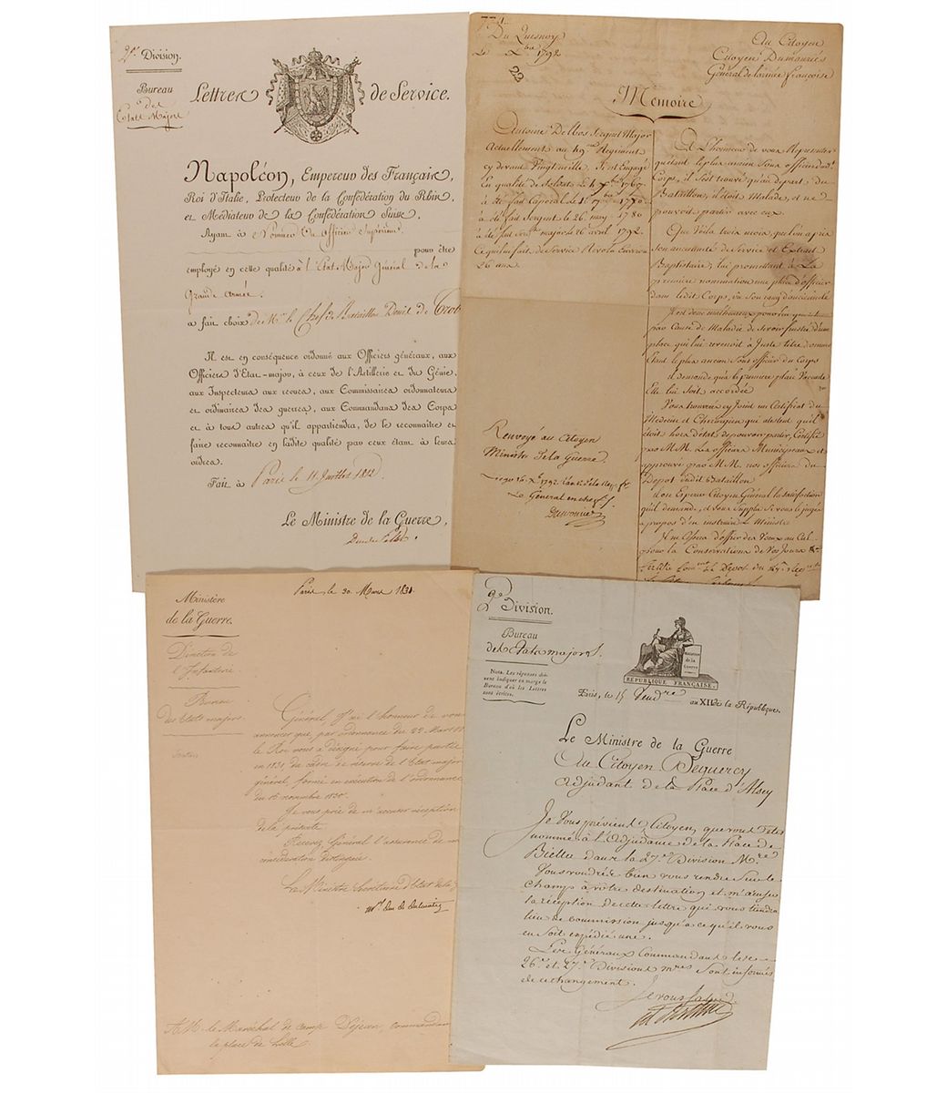 Four items, all in French: LS, signed by Alexandre Berthier, one page, October 3, 1803, naming Citizen Dequercy a Master Sargeant; DS, signed by Henri Clarke “Duc de Feltre,” dated July 12, 1812, appointing Battalion Chief Denis de Trobriand to the General Staff of the Grande Armee; DS, signed by Charles Francois Dumouriez, dated December 16, 1792, requesting the re-entry into service of Antoine Delbos, Sergeant Major of the 49th Regiment. Dumouriez signs and sends back to the Minister of War. Also signed by the Administrators of the city of Le Quesnoy; and LS from Nicholas Soult, “Mal (Marshal) Duc de Dalmatie,” March 30, 1831. A letter to General Jean Antoine Dejean informing him that the King has appointed him to the reserve corps of the General Staff. In overall very good to fine condition.