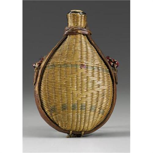 <B>Napoleonic Regimental Glass Campaign Flask </B></I><BR><I>French, circa 1812</B></I><BR><BR>The glass flask with basket cover, the front applied with a large gilt metal Napoleonic crowned eagle perched on crossed arrows, above the gold and openwork <I>no. 36</B></I>, the sides mounted in brown leather, each side attached to a red white and blue cord, with cork-7 in. long x 5 in. wide<BR><I><BR>Napoleon (1769-1821)</B></I><BR><BR>Born Napoleone di Buonaparte in 1769 on France's recently acquired island of Corsica and trained at the Royal Military School in Paris, Napoleon adeptly translated a successful military career into political leadership during the turbulent years of the French Revolution. Crowning himself Emperor of France in 1804, the ambitious general launched a dramatic campaign that soon put large swaths of continental Europe under his scepter. It was only when he launched his ill-fated invasion of Russia in 1812 that his dreams of hegemony were dashed. Defeat at Waterloo on 18 June 1815 against an alliance led by Britain and Prussia confirmed the end of Napoleon's grand ambitions. Nevertheless, his many reforms in law and administration helped modernize much of Europe.<BR><BR>Provenance:<BR>Purchased from Forsyth's, Nashville, TN <BR><BR><b>Shipping:</b> Requires 3rd Party Shipping (<a target="_blank" href="http://www.heritageauctions.com/common/shipping.php">view shipping information</a>)