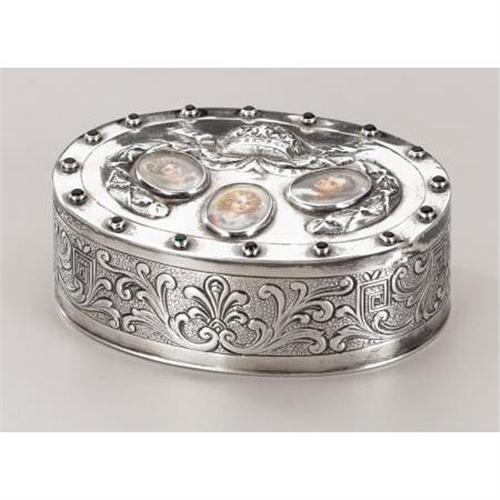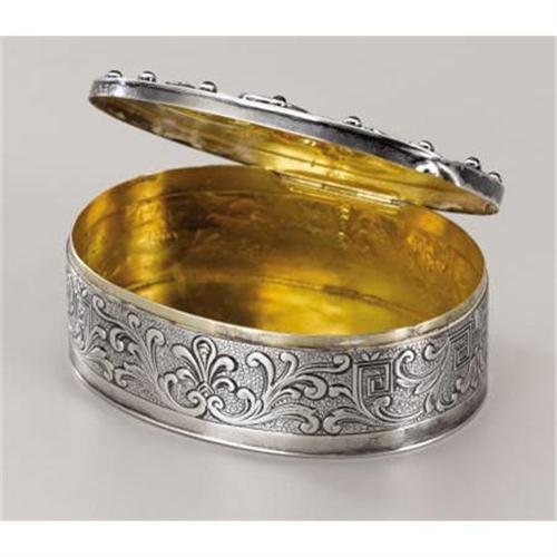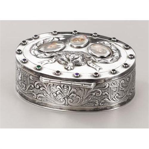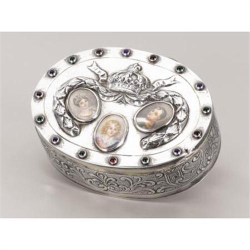 <B>French Napoleonic Silver Portrait Miniature Box</B></I><BR><I>Circa 1880, with French hallmark on base</B></I><BR><BR>Oval, inset with individual portrait miniatures of Emperor Napoleon I of France (r. 1804-1814), his wife Empress Marie Louise (1791-1847), and their son, Napoleon II, the King of Rome (1811-1832), enclosed by a <I>repoussé</B></I> ribbon-tied garland surmounted by a crown, the border set with colored glass cabochons, with engraved sides and a gilt interior-3 5/8 in. wide; 1 1/4 in. high<BR><BR>Provenance:<BR>Purchased from Lombard Antiquarian Maps & Prints