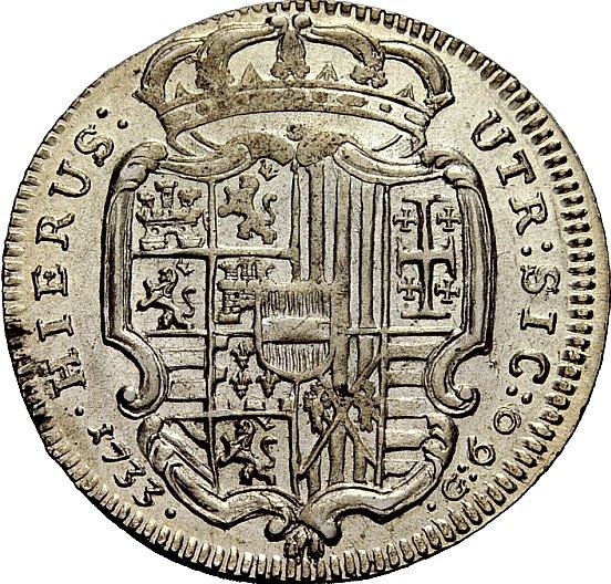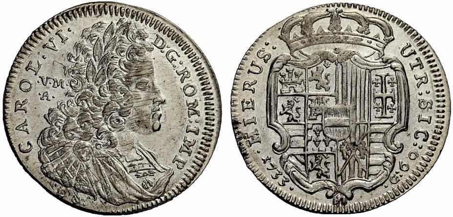 Napoli. Carlo VI d’Absburgo, 1707-1734, imperatore dal 1711. Mezza piastra 1733. AR 12,64g. Busto laureato, drappeggiato e corazzato a d. Rv. Stemma coronato. Pannuti-Riccio 8. MIR 321\2. q.Fdc