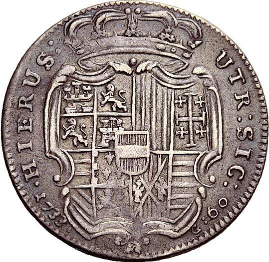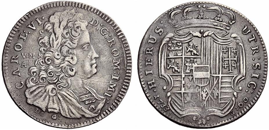 Napoli. Carlo VI d’Absburgo, 1707-1734, imperatore dal 1711. Mezza piastra 1733. AR 12,37g. Busto laureato, drappeggiato e corazzato a d. Rv. Stemma coronato. Pannuti-Riccio 8. MIR 321\2. Buon BB