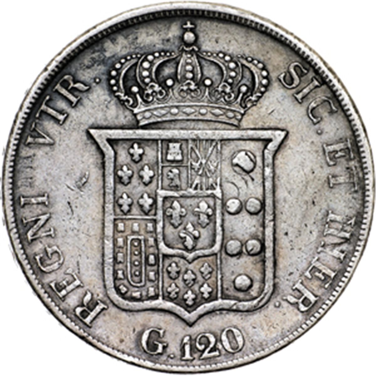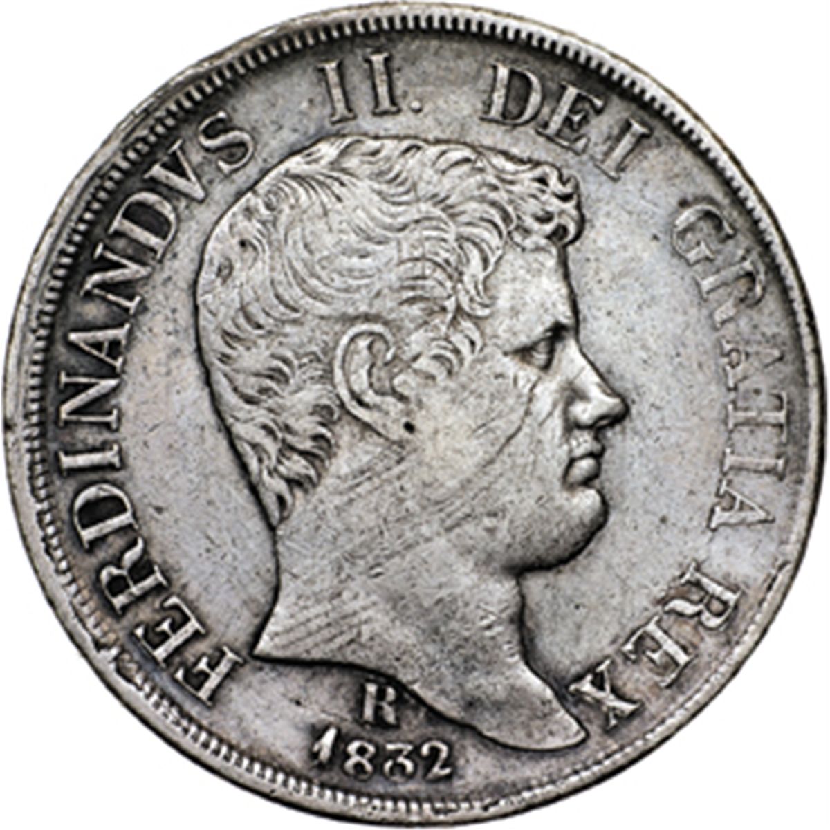 Monete e Medaglie di Zecche Italiane. Napoli. Ferdinando II (1830-1859). Piastra 1832 reimpressa. D/ FERDINANDVS III DEI GRATIA REX. Testa a destra, sotto R 1832. R/ REGNI VTR SIC ET HIER Stemma coronato sotto G. 120. MIR 499/2. P-R. 56. AG. RRR. BB. Le piastre con la R sotto il collo sono state ribattute su vecchie piastre della Repubblica Partenopea e del periodo napoleonico.
