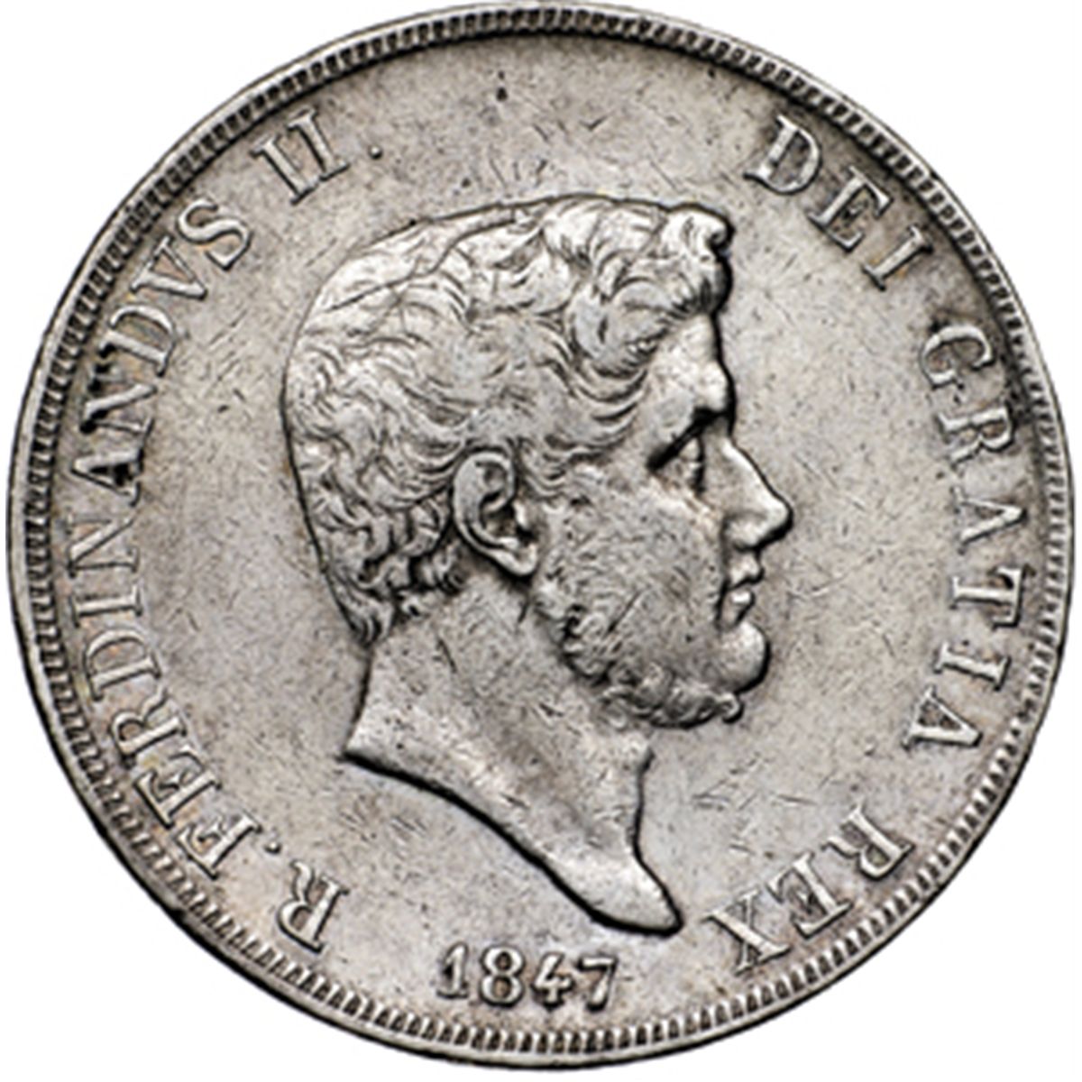 Monete e Medaglie di Zecche Italiane. Napoli. Ferdinando II (1830-1859). Piastra 1840 reimpressa. D/ FERDINANDVS II DEI GRATIA REX Testa a destra, sotto R 1847. R/ REGNI VTR SIC ET HIER Stemma coronato sotto G. 120. MIR 501/8. P.R. 73. AG. RRR. BB.