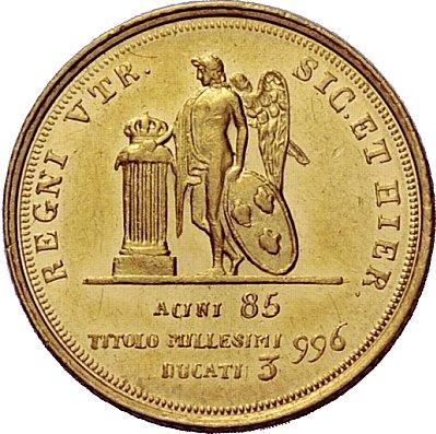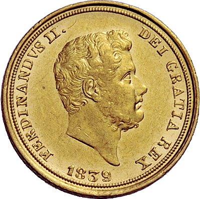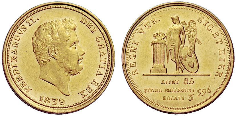 Napoli. Ferdinando II di Borbone, 1830-1859. Da 3 ducati 1839. Testa giovanile barbuta. Pagani 177. Pannuti-Riccio 43. MIR 496. Raro. Fdc