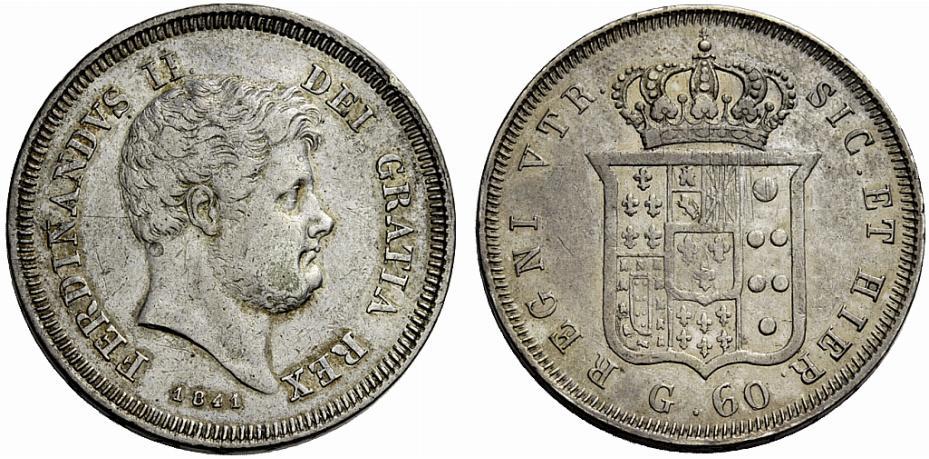 Napoli. Ferdinando II di Borbone, 1830-1859. Mezza piastra 1841. Testa giovanile barbuta. Pagani 237a. Pannuti-Riccio 98. MIR 506. Rara. BB