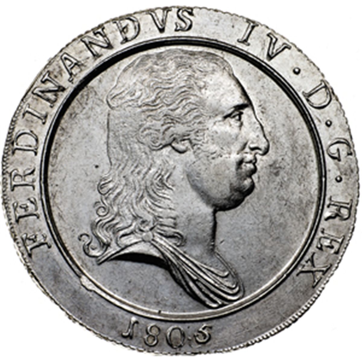 Monete e Medaglie di Zecche Italiane. Napoli. Ferdinando IV (1759-1816). Piastra 1805. Capelli lisci. MIR 424. P.R 11. AG. g. 27.58 NC. SPL. Alta conservazione.