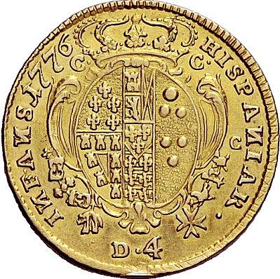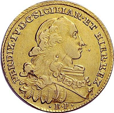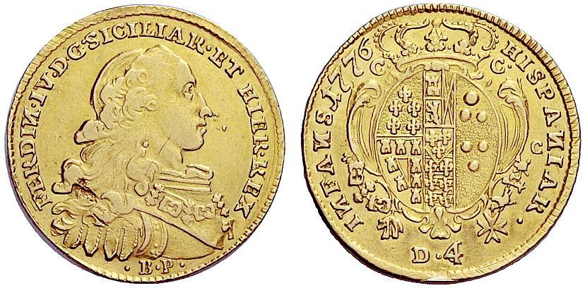 Napoli. Ferdinando IV di Borbone, 1759-1825. I periodo, 1759-1799. Da 4 ducati 1776. AV 5,83g. FERDIN IV D G SICILIAR ET HIER REX Busto adulto a d.; sotto, BP. Rv. HISPANIAR – INFANS Stemma coronato. CNI 103. Pannuti-Riccio 42. MIR 362. Rarissimo. q.BB / BB