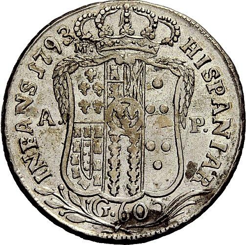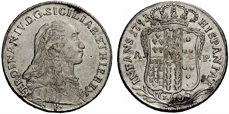 Napoli. Ferdinando IV di Borbone, 1759-1825. I periodo, 1759-1799. Mezza piastra 1793. AR 13,28g. FERDINAN IV D G SICILIAR ET HIE REX Busto adulto a d.; sotto, P. Rv. HISPANIAR-INFANS Stemma coronato. CNI 215. Pannuti-Riccio 73. MIR 379\1. BB