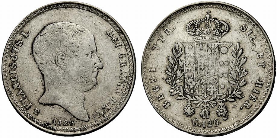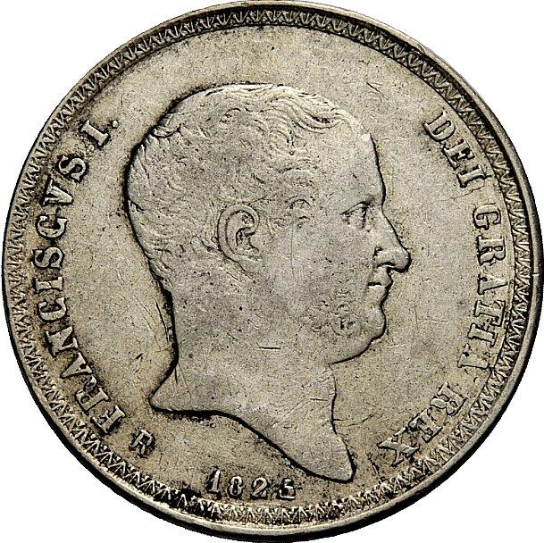 Napoli. Francesco I di Borbone, 1825-1830. Piastra reimpressa 1825. Pagani 110. Pannuti-Riccio 7. MIR 476\1. MIR 476\1. Rara. Abituali difetti di coniazione, BB