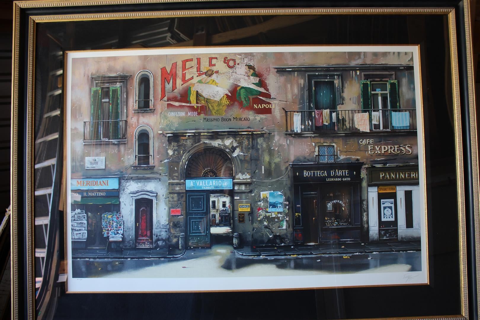 Thomas Pradzynski melds a realistic technique with the romantic subject matter of this southern Italian city sidewalk devoid of people. This serigraph #AP16/25 measures 32.5 x 48; framed images measures approx. 44.5 x 60.