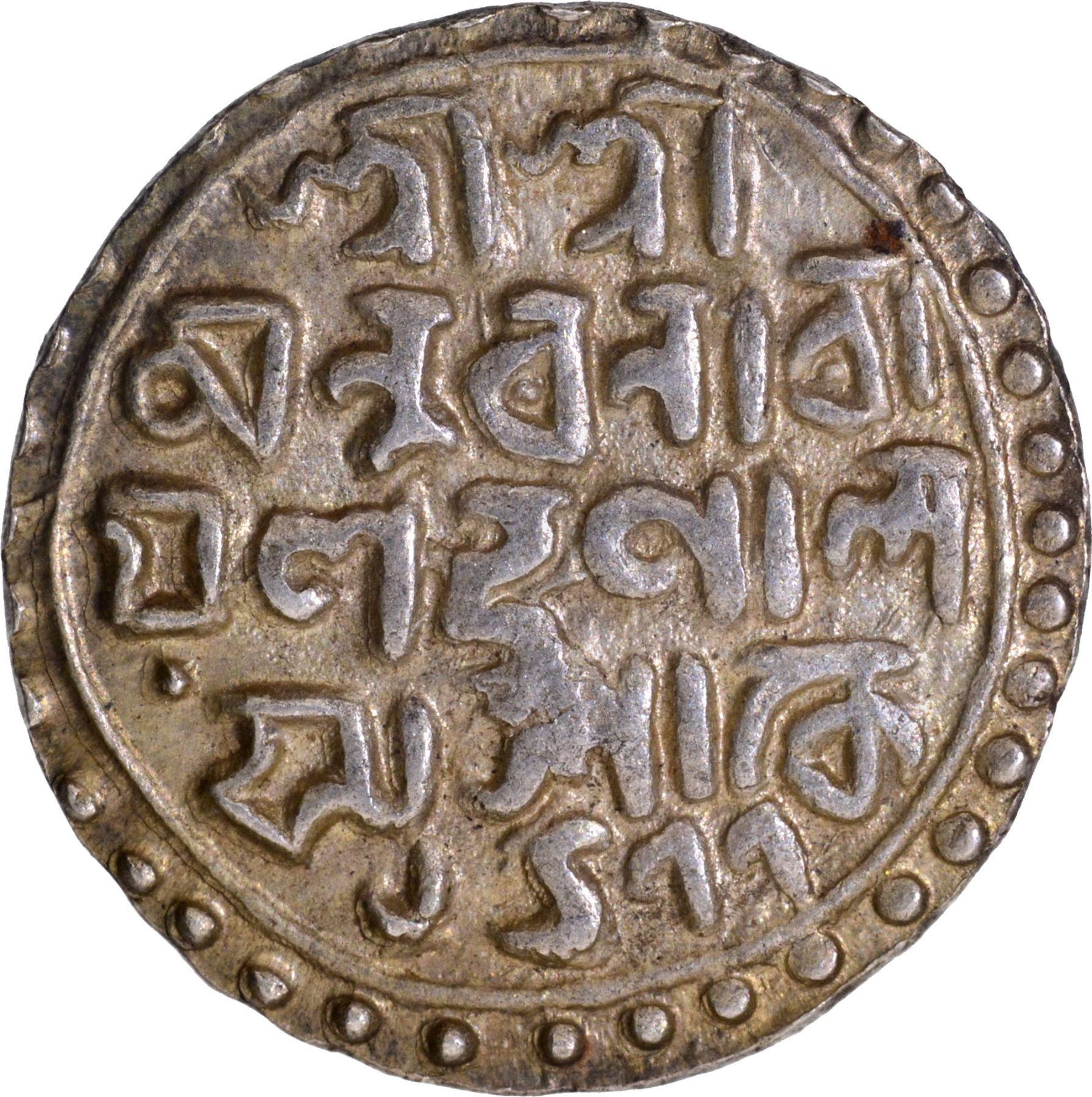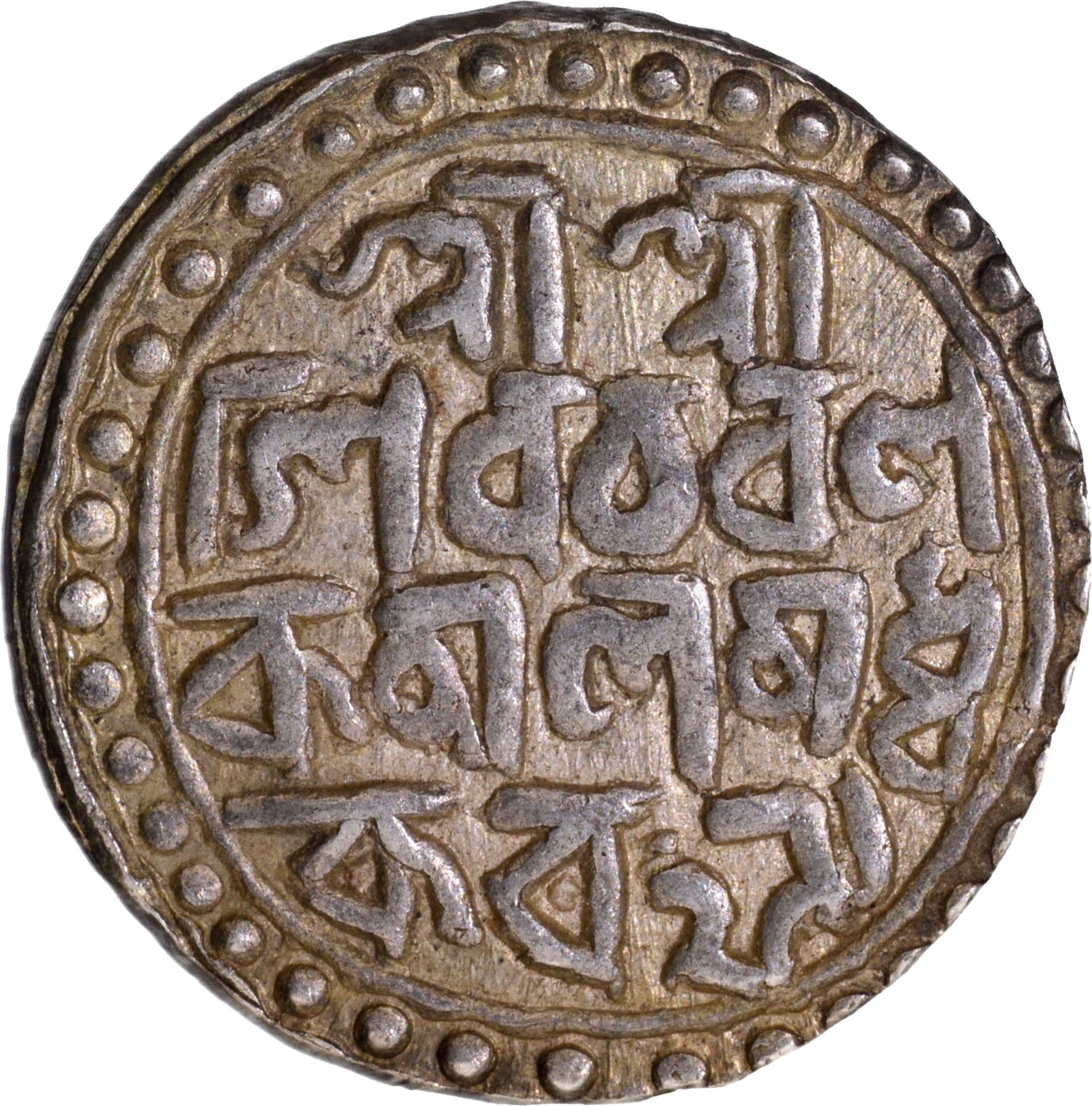 Cooch Behar, Nara Narayan (SE 1477-1509 / 1555-1587 AD), Silver Tanka, Small flan, Saka Era 1477, Obv:Bengali legend in four linesSriSri/ Siva Charana/ Kamala Madhu/ Karasya within a circle anddotted border, Rev: Bengali legend in five linesSri Sri/ man Naranara/ yana Bhupala/ syaa Sake/ 1477 within a circle and dotted border, 10.53g, 24.71mm, (KM # 36/RB # A1.49), XF-AU, Scarce.