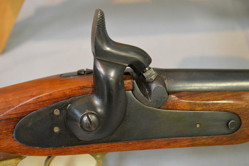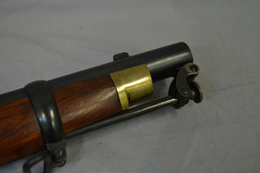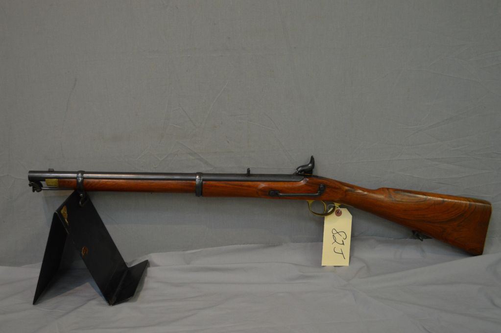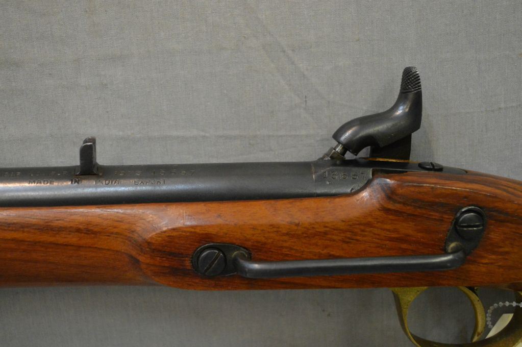 Narain Jagannath Sikligar ( Made in India ) Model Copy of Snider Enfield Cavalry Carbine .58 Perc cal Single Shot Black Powder Carbine w/ 20" bbl [ blued finish, iron lock & hammer, bands, etc - barrel sights, wooden stock w/two chips missing both sides upper tang - brass trigger guard, trigger, forend cap & butt plate, w/ attached swivel ram rod ] Ser # 13675