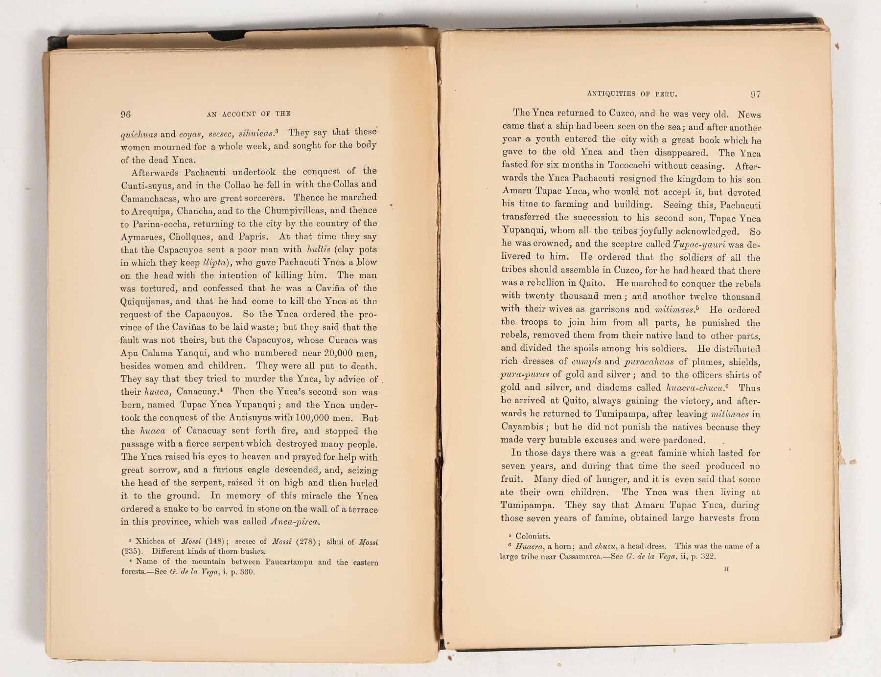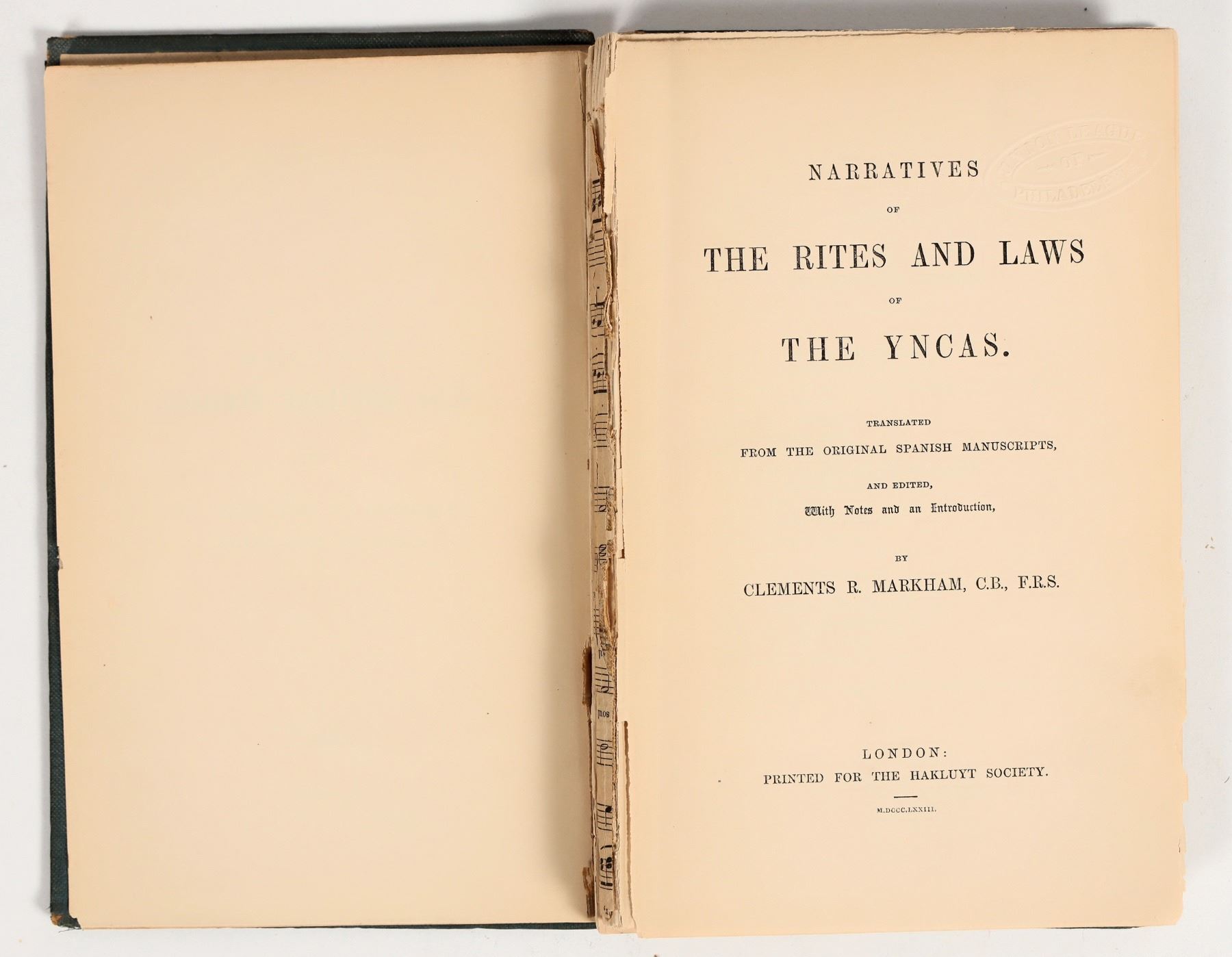 The Rites and Laws of the Yncas', translated and edited from original Spanish manuscripts by Clements R. Markham. Printed for the Hakluyt Society of London. This book, which is a historically significant anthropological text, describes the religious rituals, beliefs, and superstitions of the native inhabitants of the land that now comprises Peru. Rough condition; spine is completely gone, pages and cover are totally separated (though kept in order); see photos. 5.5"x9"x1".