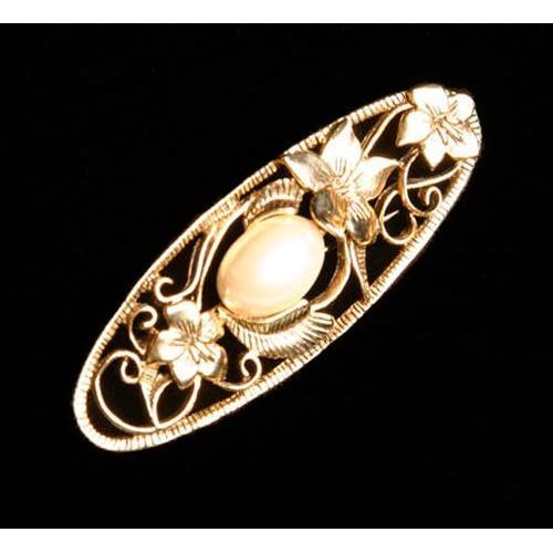 A narrow oval of gold filled with a design of gold flowers and leaves with an oval pearl accenting the center. Length: 3", Width: 1".