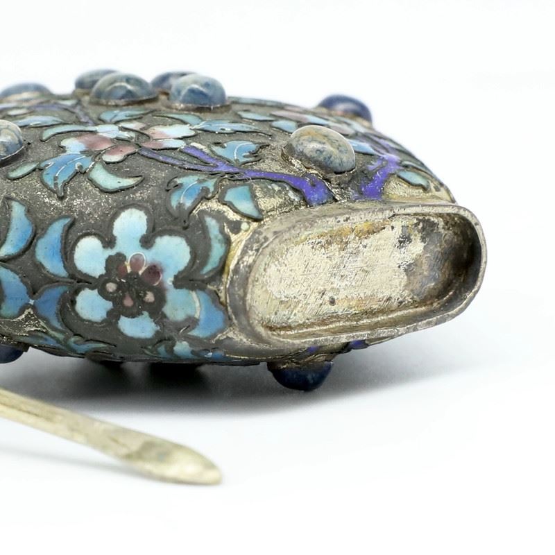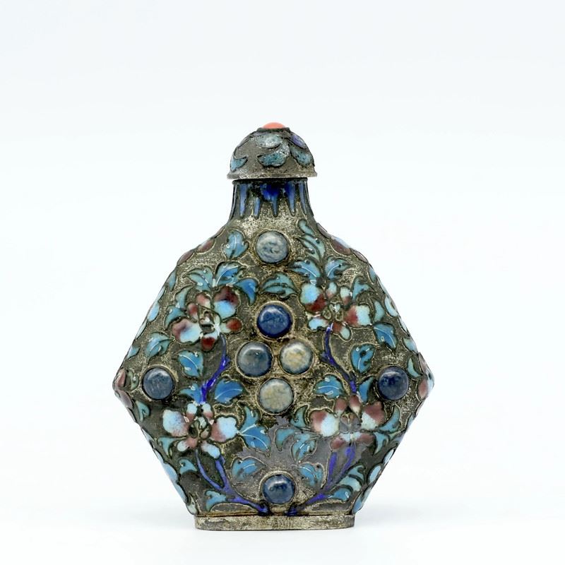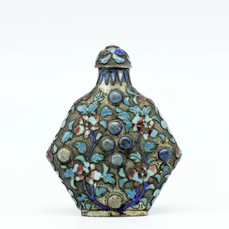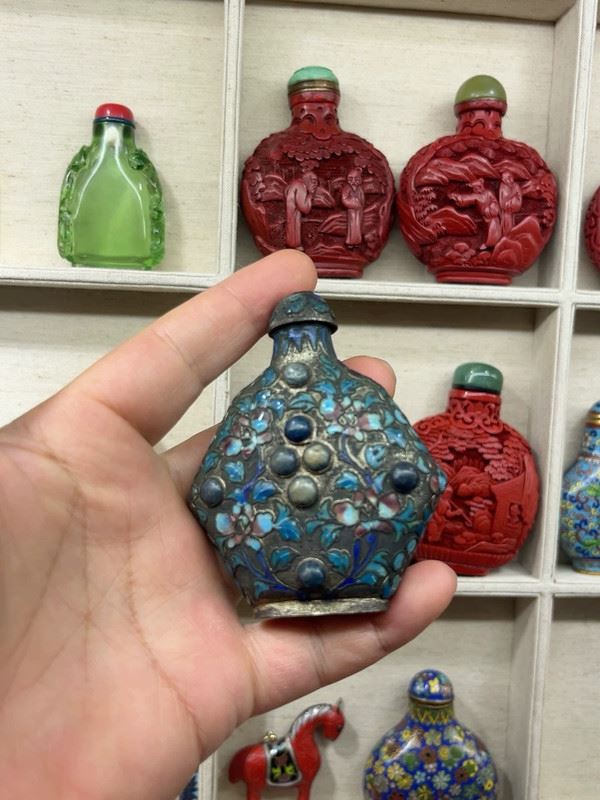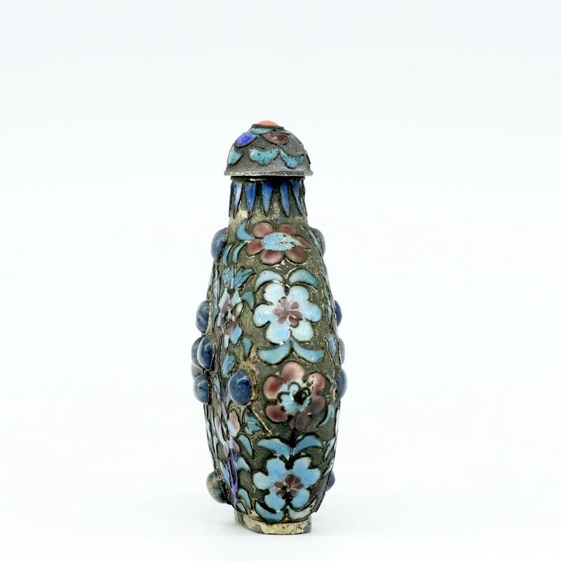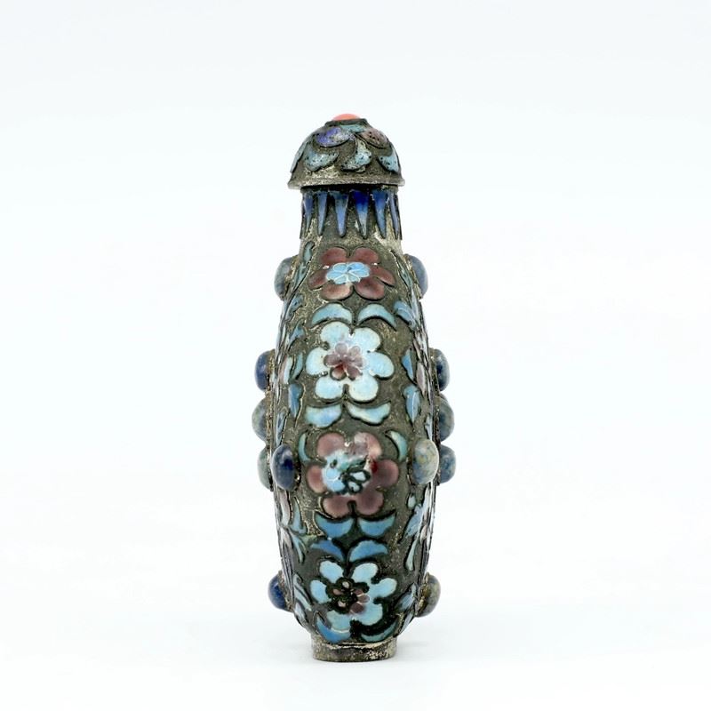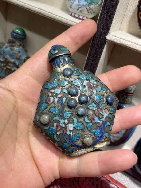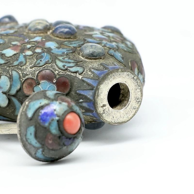 This nasal snuff bottle is crafted using cloisonné enamel techniques, with a unique shape designed for traditional nasal and throat treatments. The body is decorated with intricate floral patterns, vibrant colors, and fine details, combining practicality with artistic value. Its blend of traditional craftsmanship and modern aesthetics makes it a collectible art piece with both functional and decorative appeal.