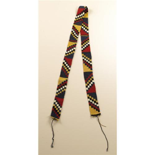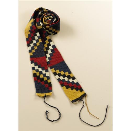 <B>Belt</B></I><BR>Nasca<BR>A.D. 100 - 500<BR>Camelid fibers, cotton<BR>Length 53 3/4 in. Width 1 3/4 in.<BR><BR>The design of this almost perfectly preserved belt in slit-tapestry weave is planned in paired units. Each unit is made up of two long rectangles with abutting solid fields of contrasting colors (blue/gold or red/blue) with their inner sides stepped downward to an edge, this edge reversing with each pair. The reserved central portion has six descending stepped bands in contrasting colors, with the addition of black and white bands. Two equally-spaced vertical stripes separate the whole into three segments of two pairs each.<BR><BR>Provenance<BR>Arte Textil (Steve Berger), San Francisco, California<BR><BR> <BR><BR><B
