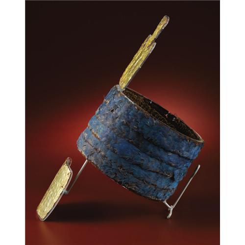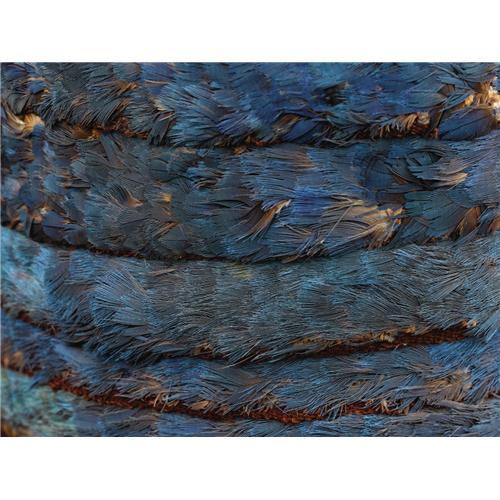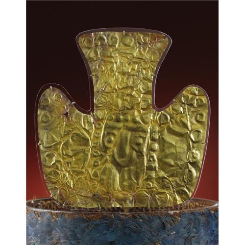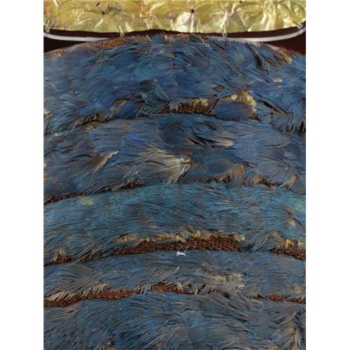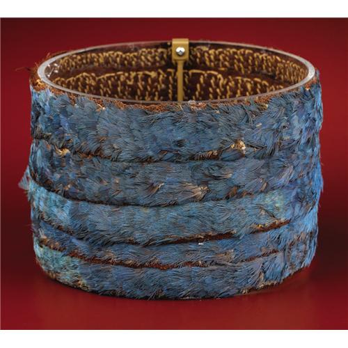 <B>Feather-covered Band for Ceremonial Attire</B></I><BR>Nasca (?)<BR>A.D. 100 - 300<BR>Macaw feathers on textile<BR>Height 5 1/2 in. Diameter (as mounted) 8 1/8 in.<BR><BR>A large amount of featherwork comes from South Coast burials and is usually designated Nasca. Blue feathers from the blue-and-yellow macaw have been sewn to a long, rather loosely-woven brown textile band. Such bands formed parts of high-status dress. The band is in good condition.<BR><BR>Provenance<BR>Bonhams & Butterfields, San Francisco: sale 7477E, 8 December 2003, lot 3066, pp.20-21 (there mounted with a gold diadem and pectoral being offered as a separate lot in the present sale)<BR><BR>