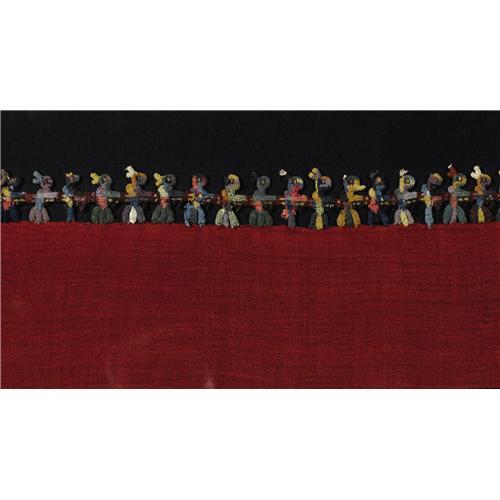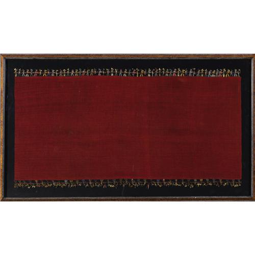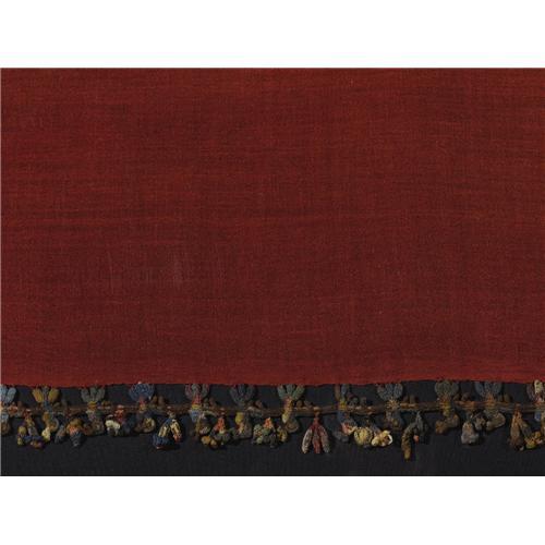 <B>Mantle with Knitted Hummingbird Borders</B></I><BR>Nasca (Early)<BR>300-100 B.C.<BR>Camelid fibers<BR>Length 55 in. Width 25 in.<BR><BR>The complex knitted border indicates that this mantle comes from the period of transition from Paracas to Nasca cultures on Peru's south coast. The brilliant cochineal red plain weave center portion is in remarkably good condition for its great age, with only one small damage spot. Although the knitted borders along the longer sides initially appear similar, they actually differ. One is comprised of a row of fifty-eight outward-facing hummingbirds knitted from eight or more variously colored fibers. The other band is comprised of thirty-eight outward-facing and equally colorful hummingbirds alternating with at least three varieties of plants outside the connecting band which runs along the wing position of the hummingbirds. The condition is quite good, with a few missing or abraded parts of the knitted borders.<BR><BR>Provenance<BR>Bonhams & Butterfields, San Francisco: sale 7437E, 9 June 2003, lot 5125, pp. 32-33<BR><BR>