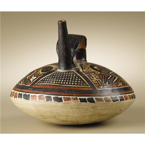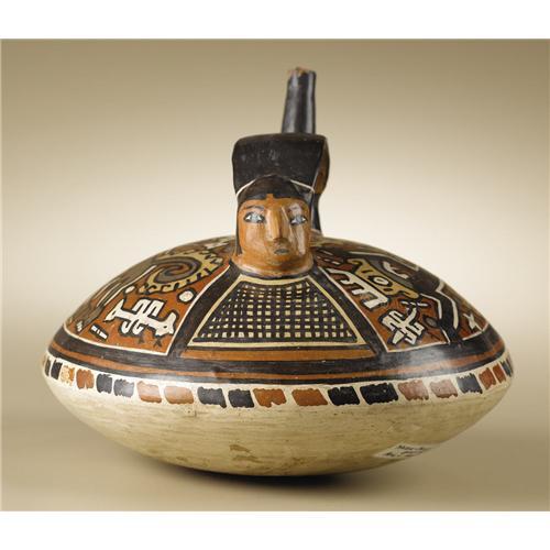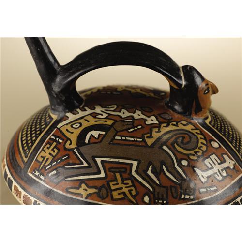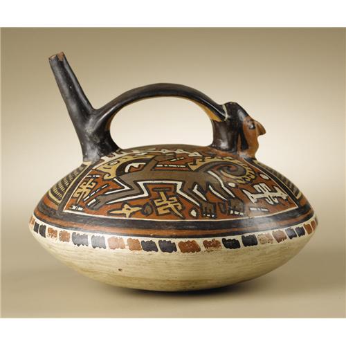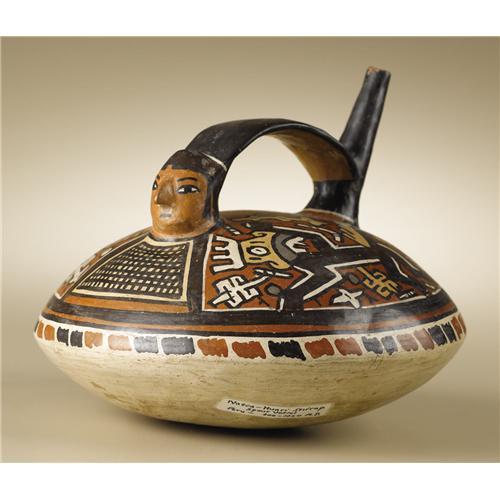 <B>Single-spout Strap-Handle Vessel</B></I><BR>Nasca<BR>100 B.C. - A.D. 250<BR>Polychrome ceramic<BR>Height 5 7/8 in. Width 7 1/2 in.<BR><BR>The broad, low-contoured vessel has an upright, forward-facing human head rendered in the round in lieu of one spout. A painted bib-like shape with square hatching below the head and the opposite spout defines the space of the figure. The large remaining spaces on either upper surface show profile mythologized monkeys surrounded by disembodied symbolic emblems. A band of freely rendered alternating pairs of reddish and black rectangular shapes lies along the bend of the vessel's profile. The vessel is chipped at the top of the spout, but otherwise good, with no waxing. A small spot was drilled in the bottom to take a clay sample.<BR><BR>Provenance<BR>Sotheby's, New York: sale 7902, 15 May 2003, lot 271, p.182 <BR><BR>