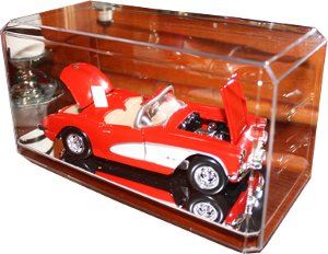 This product is injection molded, using water-clear polystyrene. The result is a very clear, hard (rigid) plastic container, that displays the contents well. Perfect For 1:24 and larger scale vehicles. Stackable. Overall Size - 9" x 4.38" x 4.13". A great way to display your diecast with Mirror-like Base. (Diecast not included)