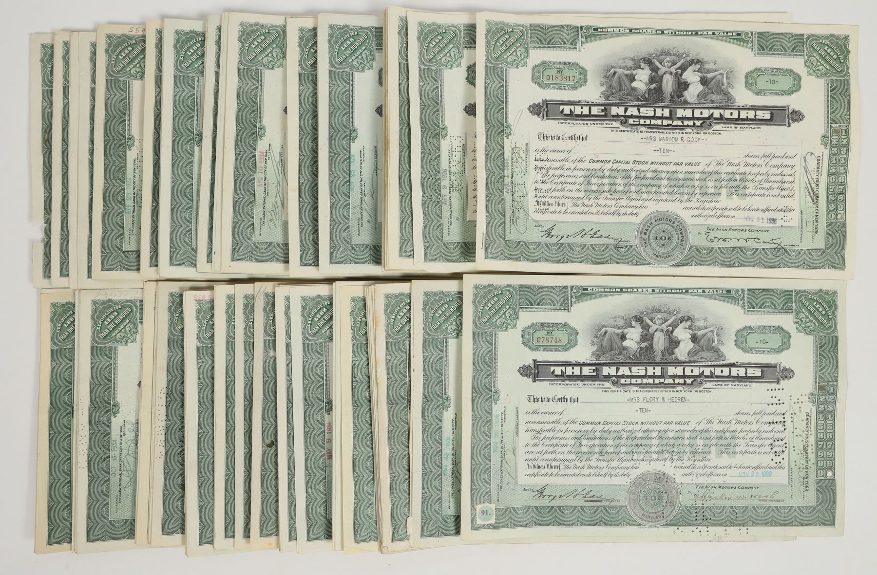 Nash Motors Company Stocks. 2 Varieties. About 120 stocks Issued c1930s. Nash Motors was an American automobile manufacturer based in Kenosha, Wisconsin. Incorporated in Maryland. Nash pioneered some important innovations; in 1938 they debuted the heating and ventilation system which is still used today, unibody construction in 1941, seat belts in 1950, a US built compact car in 1950, and muscle cars in 1957, according to Wiki. See Photo.
