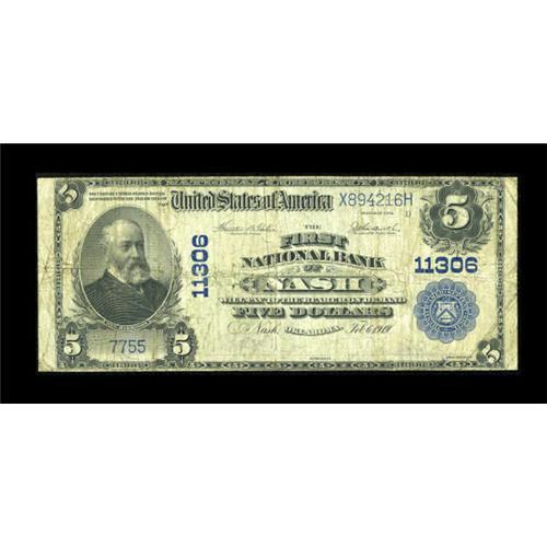 <B>Nash, OK</B></I> - $5 1902 Plain Back Fr. 606 <B>The First NB</B></I> Ch. # 11306<BR> A November 2004 auction was the last appearance of a large size issue from this bank. This piece boasts solid paper. <B>Fine.</B></I><BR><BR><b>Shipping:</b> Coins & Currency (<a target="_blank" href="http://www.heritageauctions.com/common/shipping.php">view shipping information</a>)