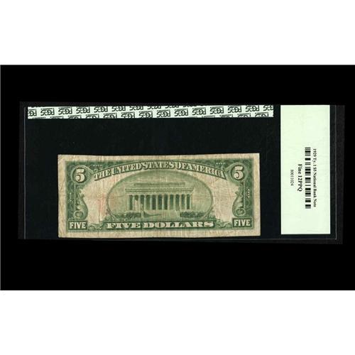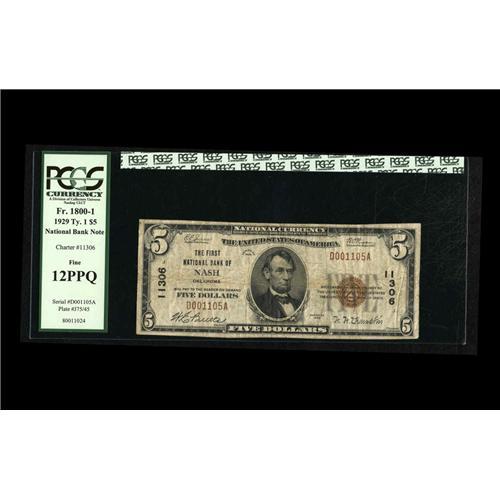 <B>Nash, OK</B></I> - $5 1929 Ty. 1 <B>The First NB </B></I> Ch. # 11306<BR>This small bank was the only issuer located in this isolated Grant County locale and ordered only the $5 denomination in Plain Backs and both types of the 1929 series. It is certified as <B>PCGS Fine 12PPQ.</B></I> We expect that this scarce piece will sell for no less than ...