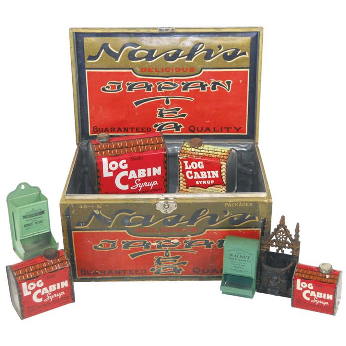 Nash's Japan Tea counter display box, (4) Log Cabin Syrup tins, Walnut Fruit & Grocery Co.-Walnut, I