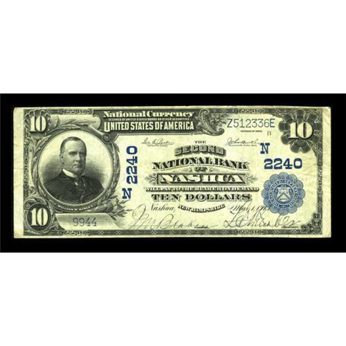 <B>Nashua, NH</B></I> - $10 1902 Plain Back Fr. 631 <B>The Second NB</B></I> Ch. # (N)2240<BR> A touch of soiling on the back is noticed on this well signed <B>Very Fine-Extremely Fine</B></I> note.<BR><BR><b>Shipping:</b> Coins & Currency (<a target="_blank" href="http://www.heritageauctions.com/common/shipping.php">view shipping information</a>)