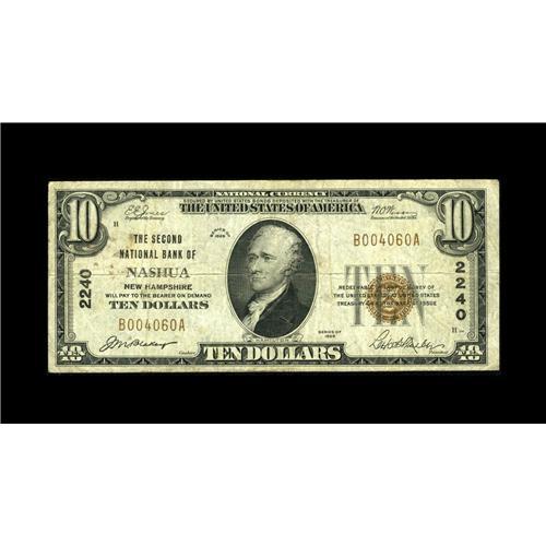 <B>Nashua, NH</B></I> - $10 1929 Ty. 1 <B>The Second NB</B></I> Ch. # 2240<BR>Although there were four issuing banks located here, this was one of only two that survived long enough to issue the 1929 series. <B>Fine,</B></I> with an unobtrusive area of subtle staining at left on the face.