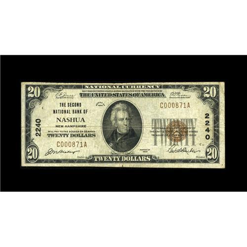 <B>Nashua, NH</B></I> - $20 1929 Ty. 1 <B>The Second NB</B></I> Ch. # 2240<BR><B>Fine</B></I> and nicely matched from the standpoint of overall appearance to the $10 from here offered above.