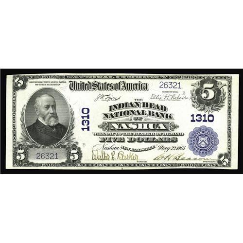 <B>Nashua, NH</B></I> - $5 1902 Plain Back Fr. 598 <B>The Indian Head NB</B></I> Ch. # 1310<BR>An exceptionally attractive note bearing a sought after title which is unique to this bank. <B>Extremely Fine+++,</B></I> with bright white paper, a vivid blue overprint, and bold pen signatures, in all a premium specimen.