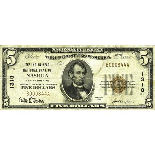 <B>Nashua, NH</B></I> - $5 1929 Ty. 1 <B>The Indian Head NB</B></I> Ch. # 1310<BR>One of the great titles in Nationals and used only by this bank, where small size notes are even scarcer than large. This is just the sixth $5 Type 1 traced from here and is an attractive <B>Fine+</B></I>.