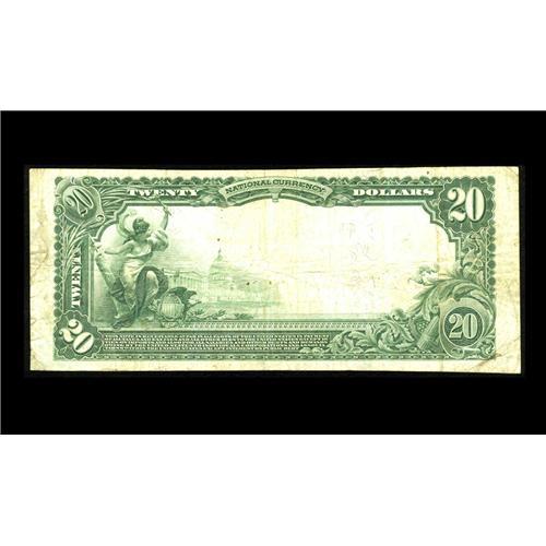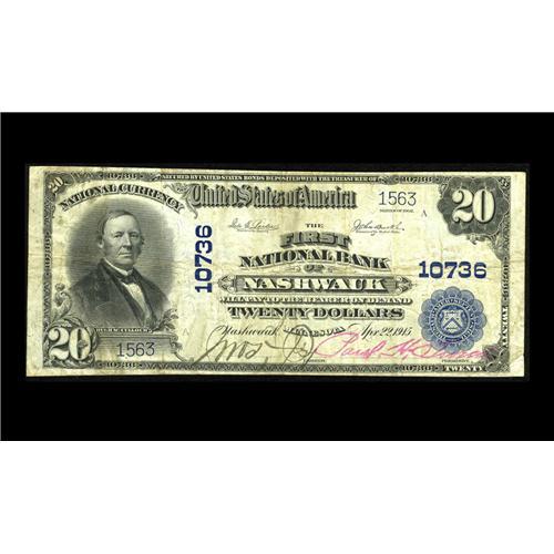 <B>Nashwauk, MN</B></I> - $20 1902 Plain Back Fr. 657 <B>The First NB</B></I> Ch. # 10736<BR>There were only two issuers in this community and both are quite scarce. This was the first local financial institution to be awarded its Federal charter. As of 1935, only $1,300 of its large emissions were still unredeemed. The latest published Kelly census lists a population of only four large survivors, so plan on some competition from other Minnesota collectors tonight. <B>Very Fine,</B></I> with the signatures still legible and margins all around.