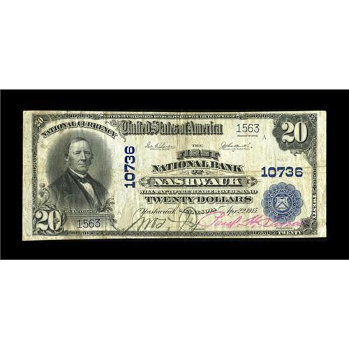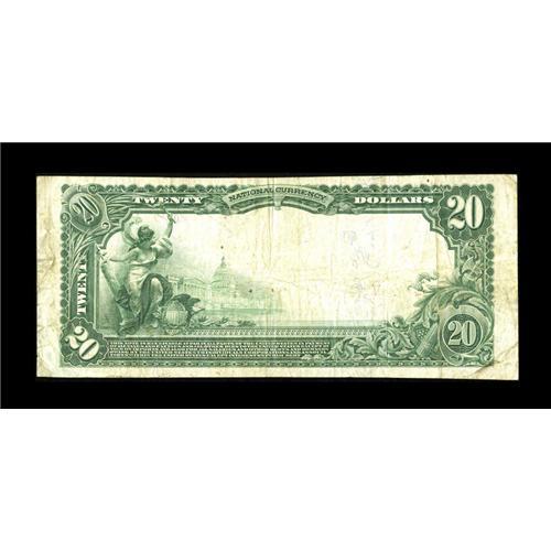<B>Nashwauk, MN</B></I> - $20 1902 Plain Back Fr. 657 <B>The First NB</B></I> Ch. # 10736<BR>There were only two issuers in this community and both are quite scarce. This was the first local financial institution to be awarded its Federal charter. As of 1935, only $1,300 of its large emissions were still unredeemed. The latest published Kelly census lists a population of only four large survivors, so plan on some competition from other Minnesota collectors tonight. <B>Very Fine,</B></I> with the signatures still legible and margins all around.<BR><BR><b>Shipping:</b> Coin/Currency (<a target="_blank" href="http://www.heritageauctions.com/common/shipping.php">view shipping information</a>)