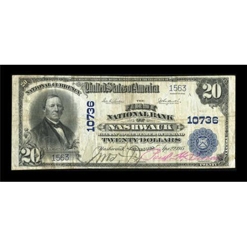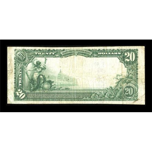 <B>Nashwauk, MN</B></I> - $20 1902 Plain Back Fr. 657 <B>The First NB</B></I> Ch. # 10736<BR> There were only two issuers in this community and both are quite scarce. This was the first local financial institution to be awarded its Federal charter. As of 1935, only $1,300 of its large emissions were still unredeemed. The latest published Kelly census lists a population of only five large survivors. <B>Very Fine,</B></I> with the signatures still legible and margins all around.<BR><BR><b>Shipping:</b> Coins & Currency (<a target="_blank" href="http://www.heritageauctions.com/common/shipping.php">view shipping information</a>)
