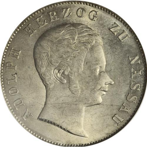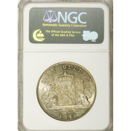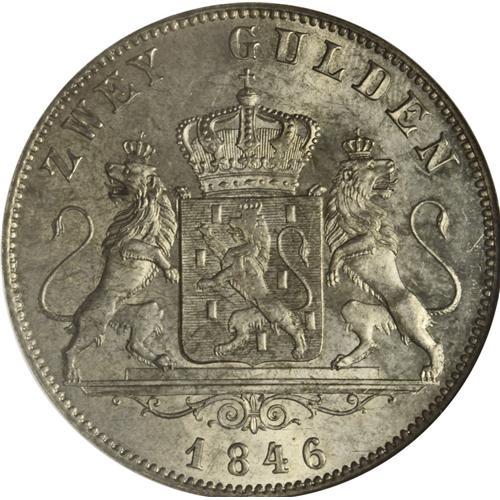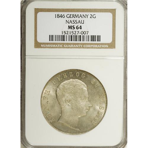 <B>Nassau. Adolph 2 Gulden 1846,</B></I> KM-C65, Dav-746, MS64 NGC. Full mint frost with light golden toning and a few light contact marks.<BR><BR><b>Shipping:</b> Coin/Currency (<a target="_blank" href="http://www.heritageauctions.com/common/shipping.php">view shipping information</a>)