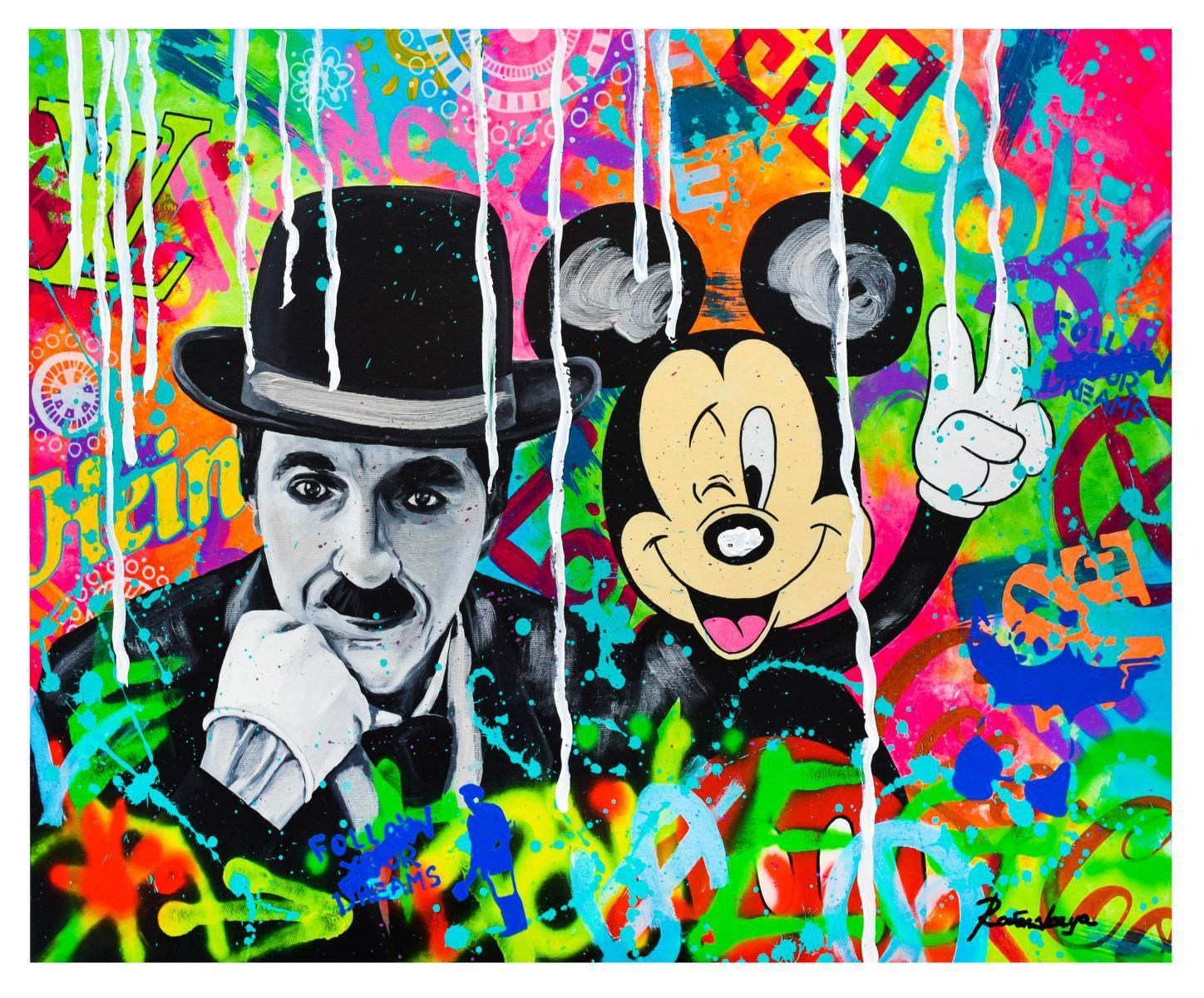 Artist: Nastya Rovenskaya. Medium: Mixed Media. Title: Chaplin & Mickey Mouse. Size (Unframed): 24" x 30". Certificate of Authenticity: From the publisher. Reference# 14941.