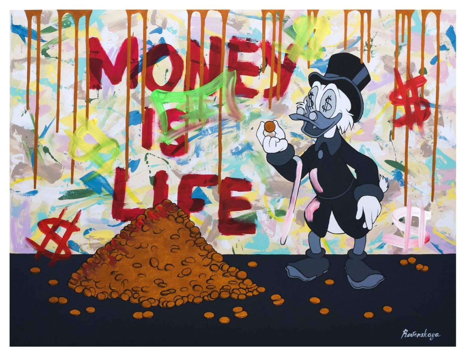 Artist: Nastya Rovenskaya. Medium: Mixed Media. Title: Money is Life. Size (Unframed): 30" x 40". Certificate of Authenticity: From the publisher. Additional: Original one of a kind. Unframed. Reference# 12110.