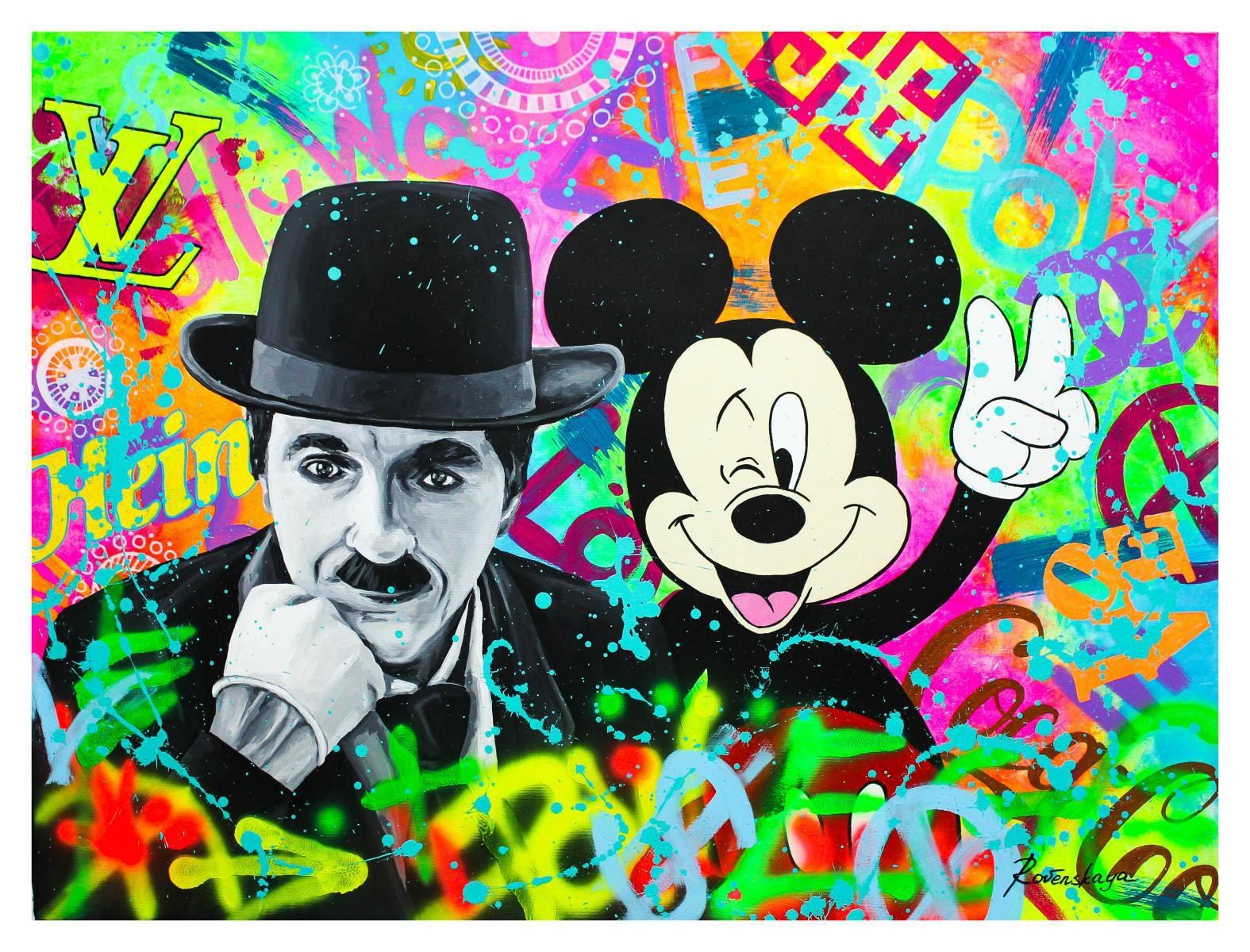 Artist: Nastya Rovenskaya. Medium: Original Oil on Canvas. Title: Chaplin & Mickey Mouse. Size (Unframed): 30" x 40". Certificate of Authenticity: From the publisher. Reference# 13563.