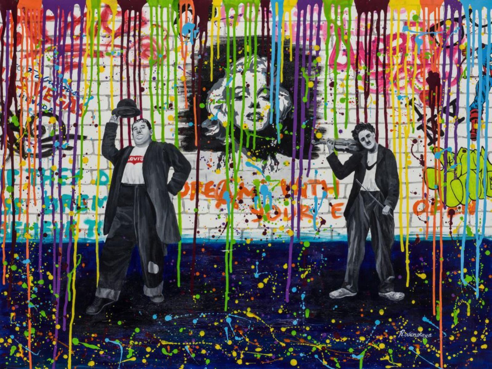 Artist: Nastya Rovenskaya. Medium: Original Oil on Canvas. Title: Chaplin and Hardy. Size (Unframed): 30" x 40". Certificate of Authenticity: From the publisher. Reference# 10377.